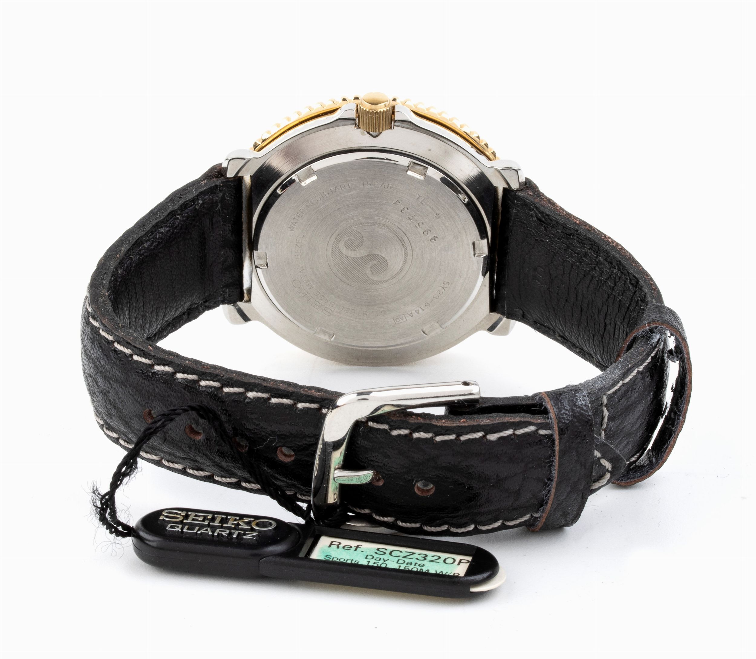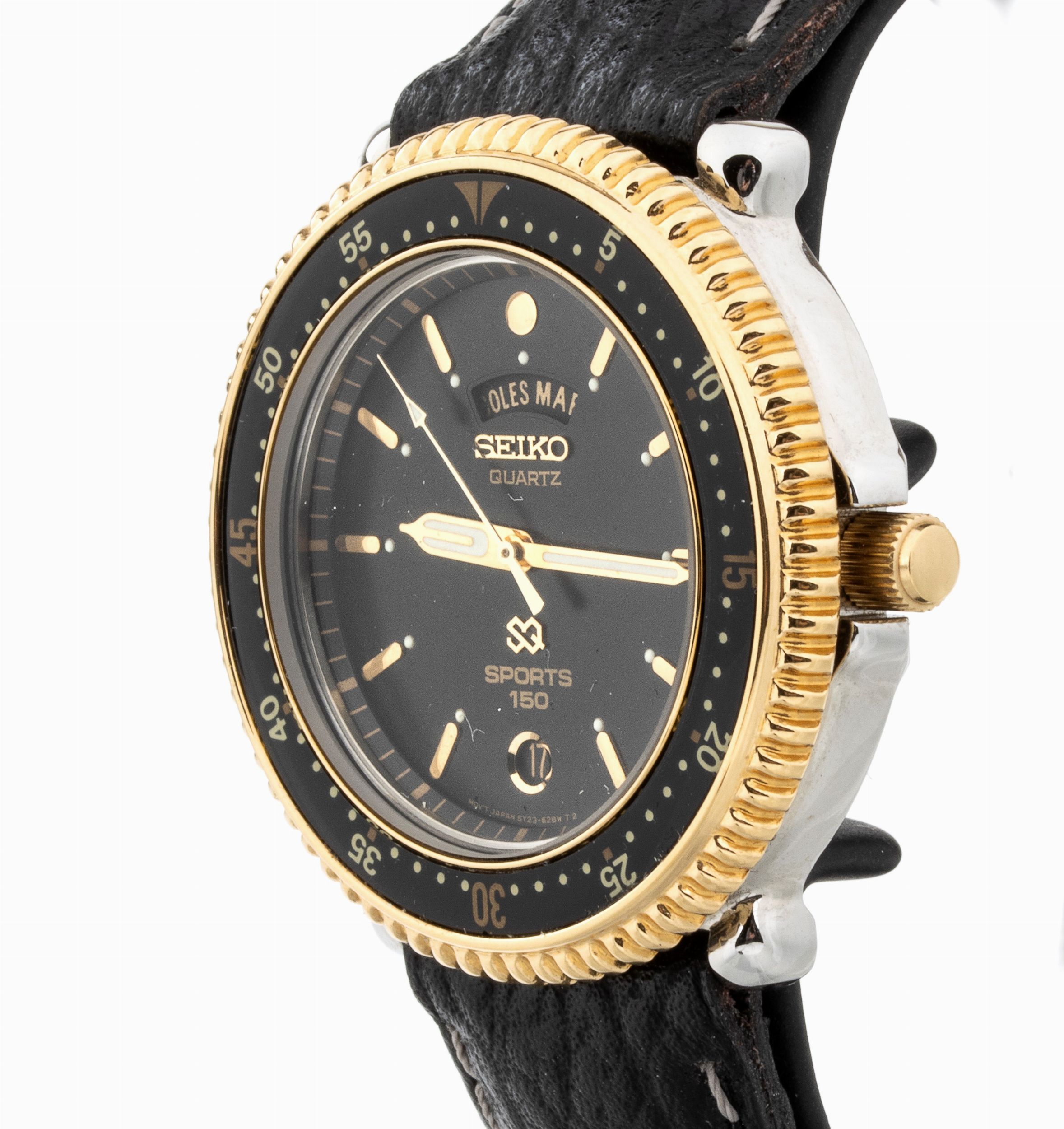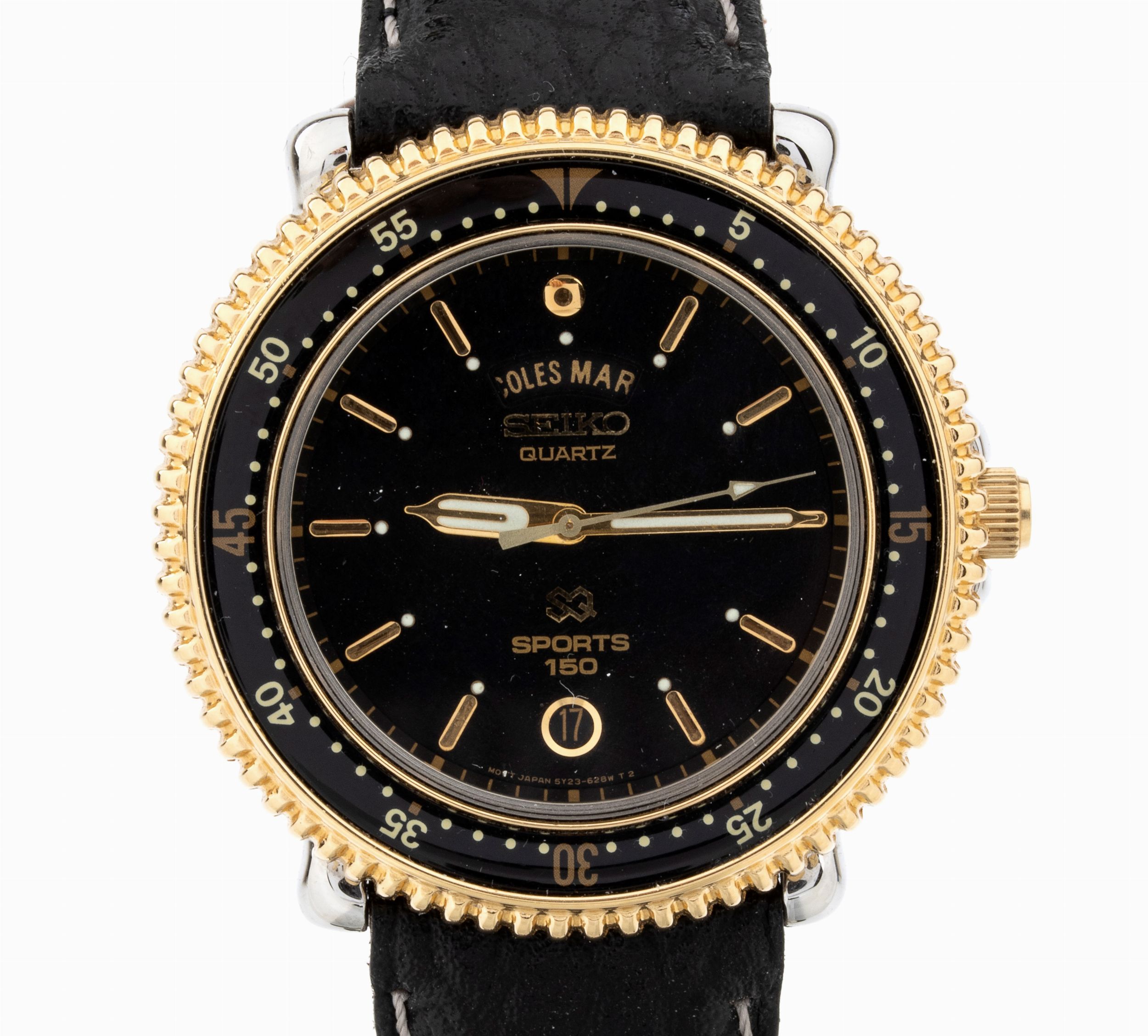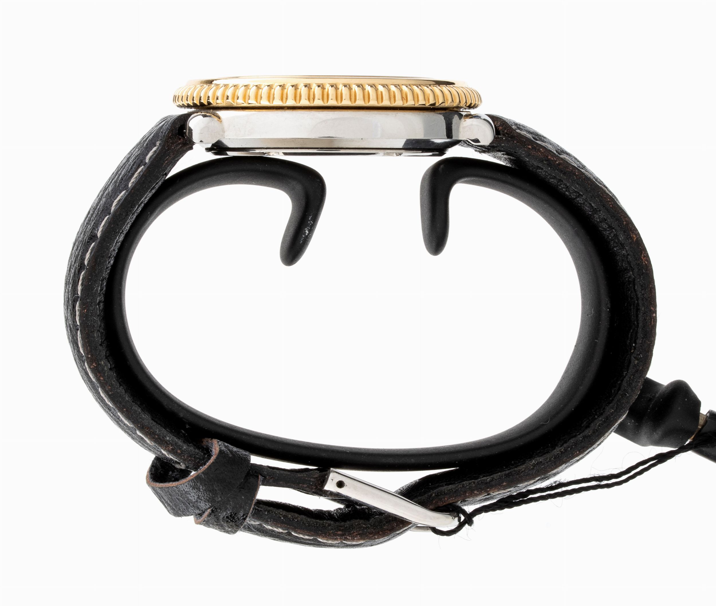 cassa in acciaio con ghiera girevole dorata, cinturino in pelle.
