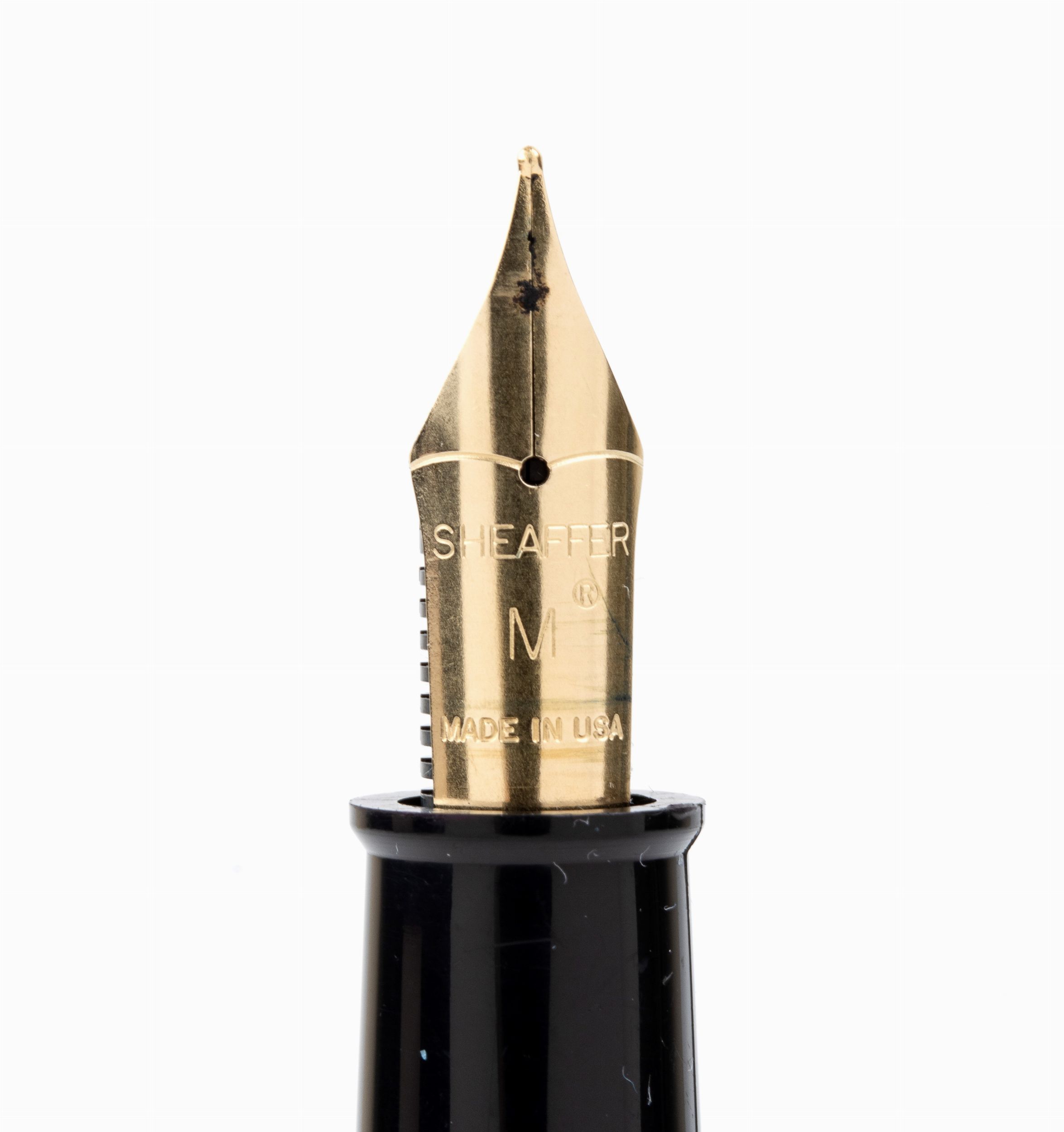 corpo e cappuccio in resina rossa con clip dorata, pennino riportante la dicitura Sheaffer - Made in USA - M. Sistema di caricamento a cartuccia.