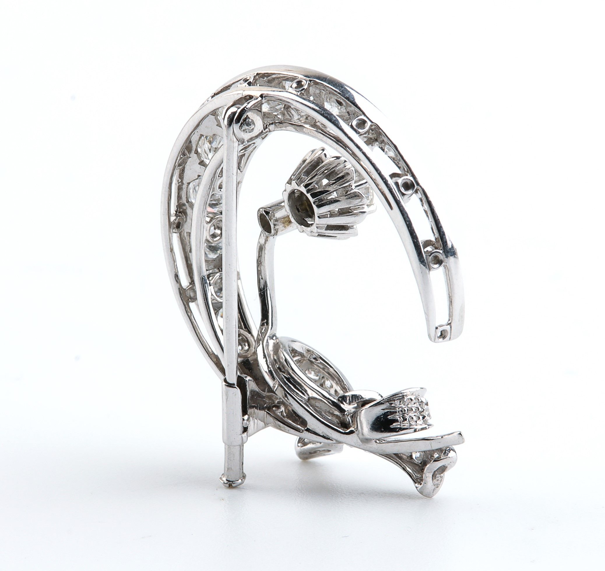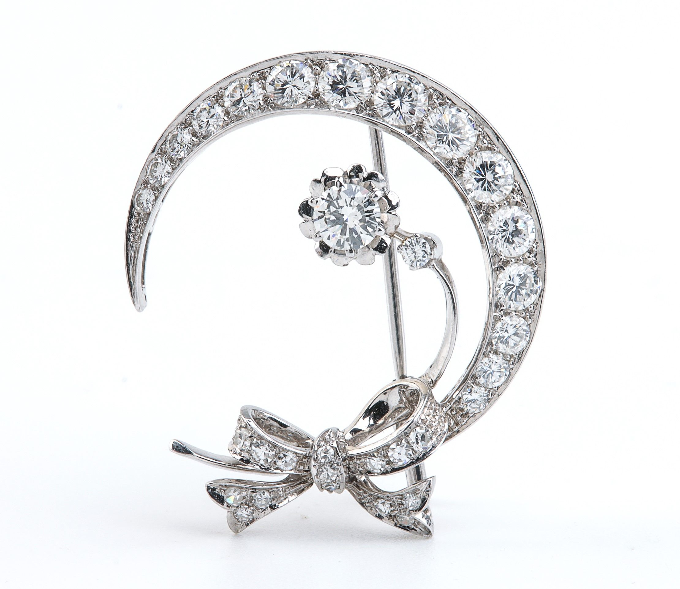 spilla a forma di mezzaluna con motivo di fiocco e fiore in diamanti.