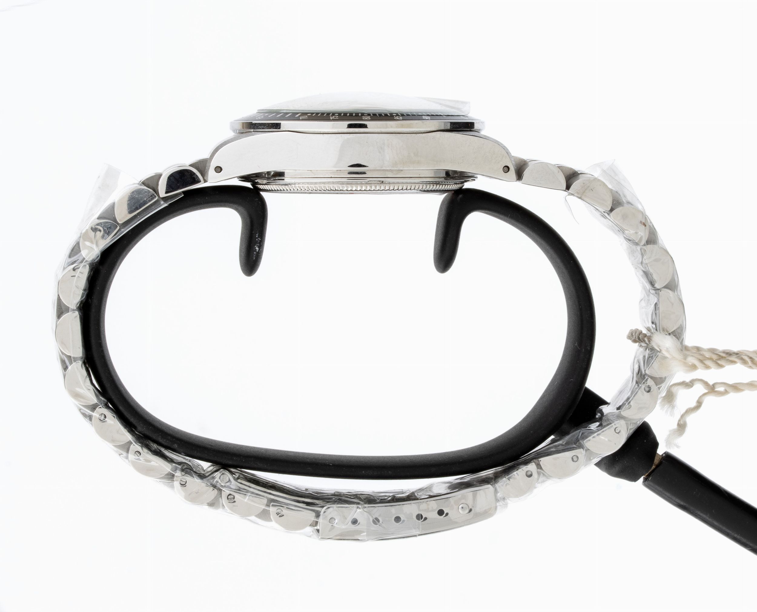 cassa e bracciale in acciaio dorato con lunetta tachimetrica nera, contatori rosa