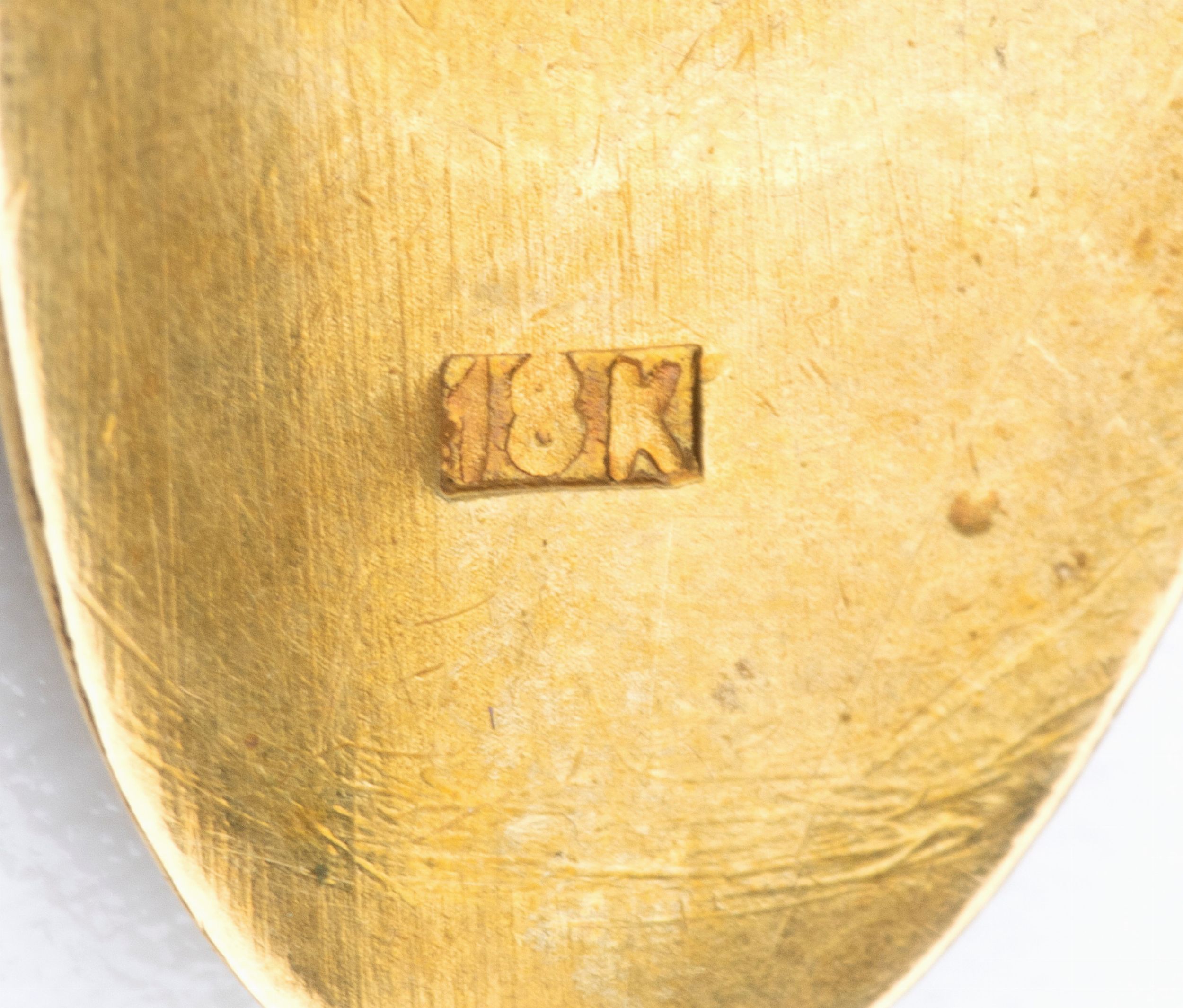 Dimensioni gemelli 2,3 x 3 cm, punzonati 18K. Lunghezza fermacravatta 6,3 cm, punzonato 750 - 387 VI.