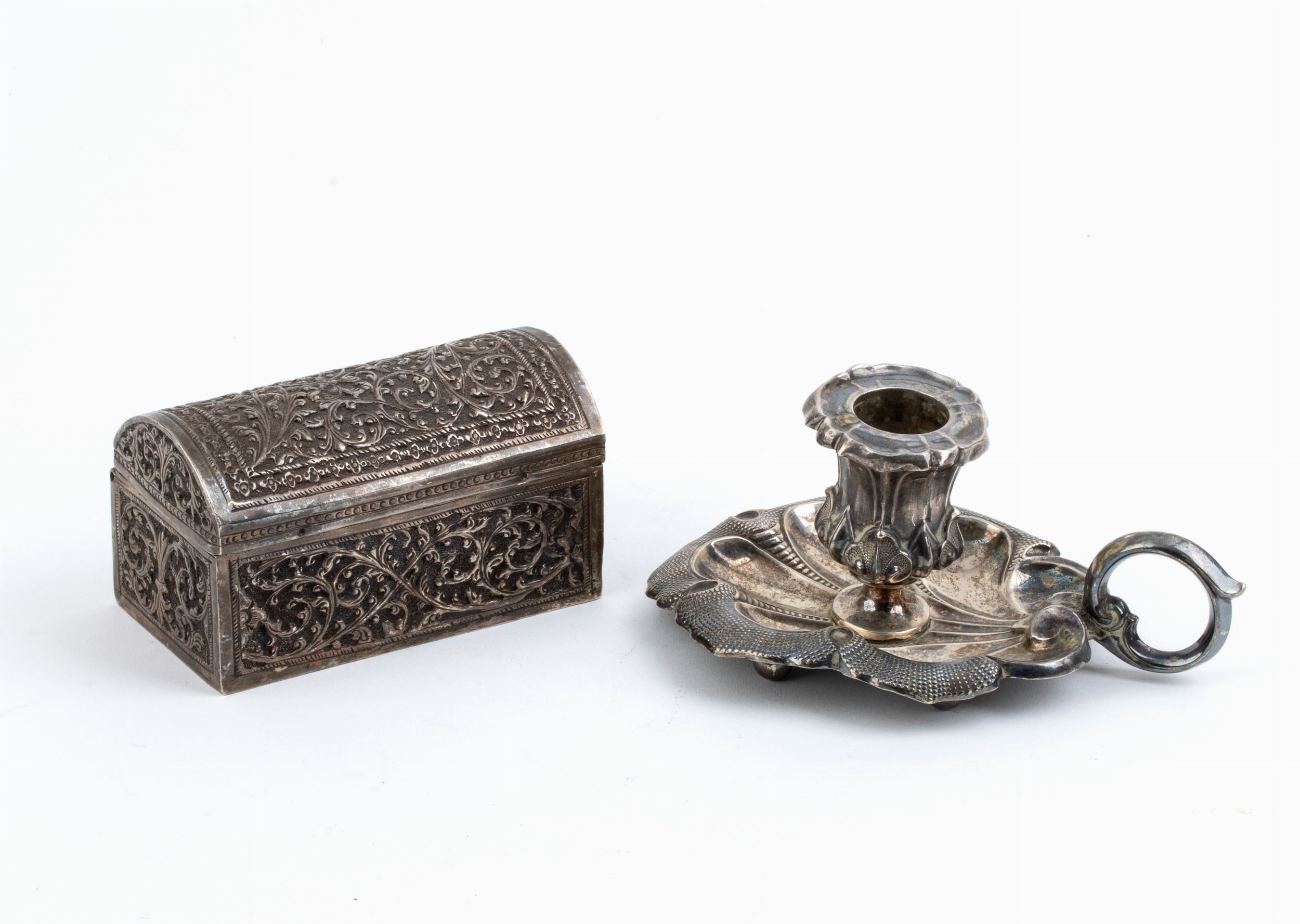 bugia in argento 800/1000, punzonata 800;scatola in argento 925/1000, punzonata 925 - SILVER.Dimensioni bugia 7 x 15 x 9 cm; dimensioni scatola 6 x 10,5 x 5,5 cm. Stato di conservazione: **** buono.