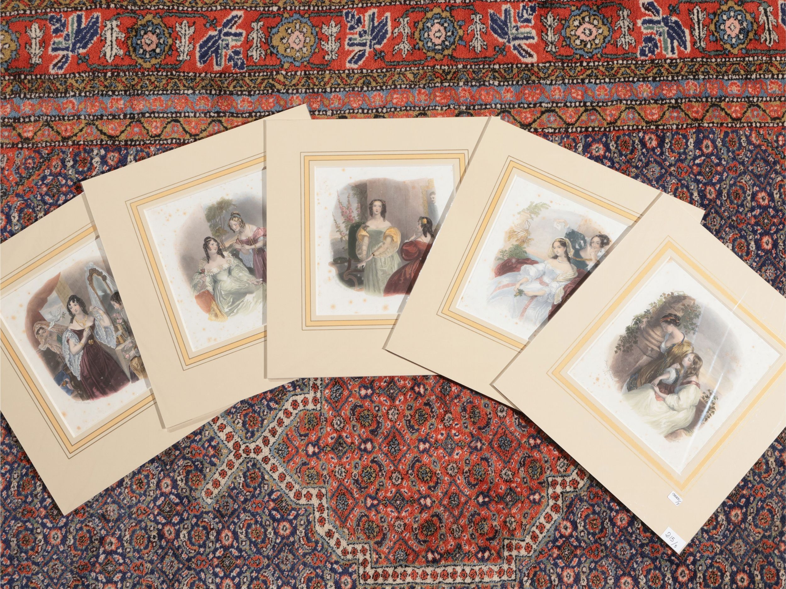 XIX secolo cinque incisioni su acciaio, colorate, con passe-partout, tracce di foxing