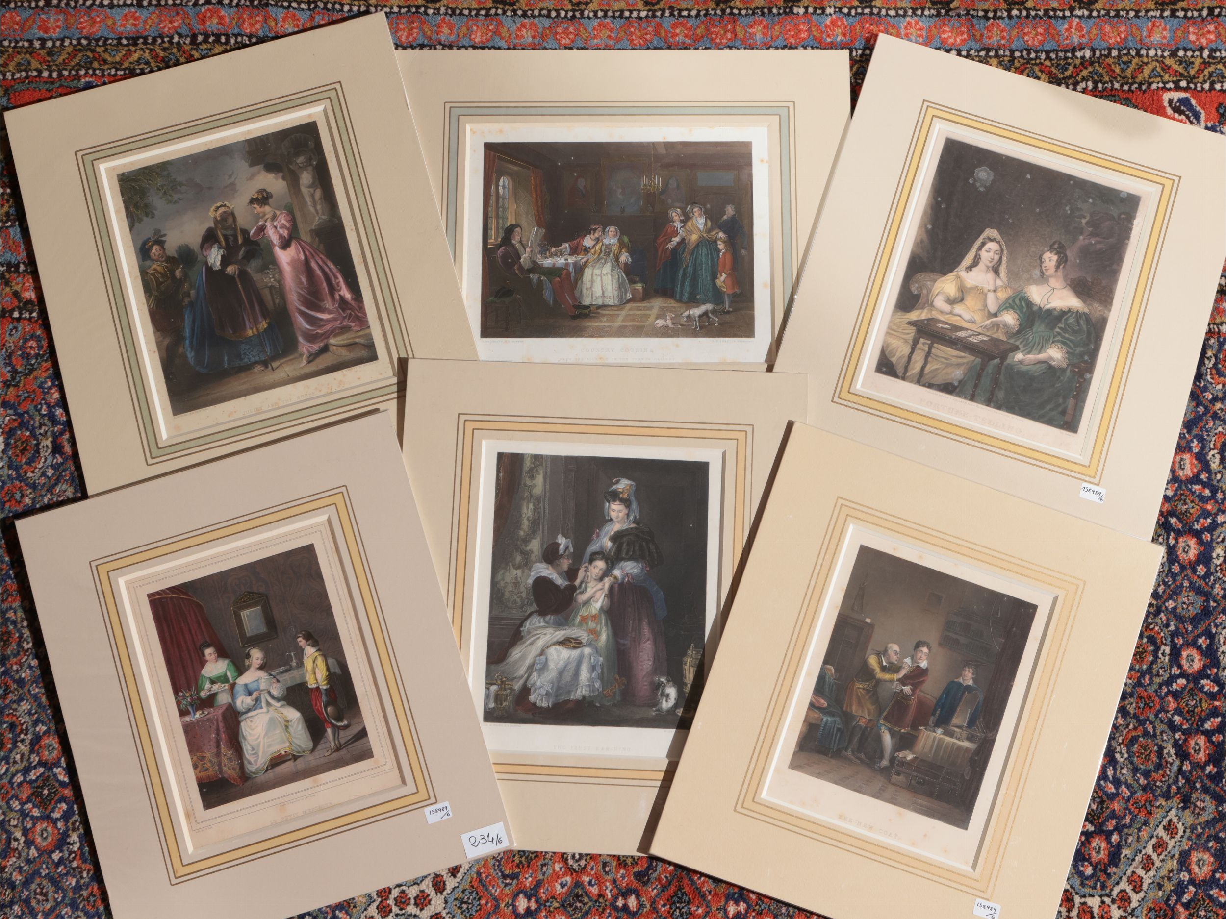 XIX secolo sei incisioni su acciaio, colorate, con passe-partout, tracce di foxing