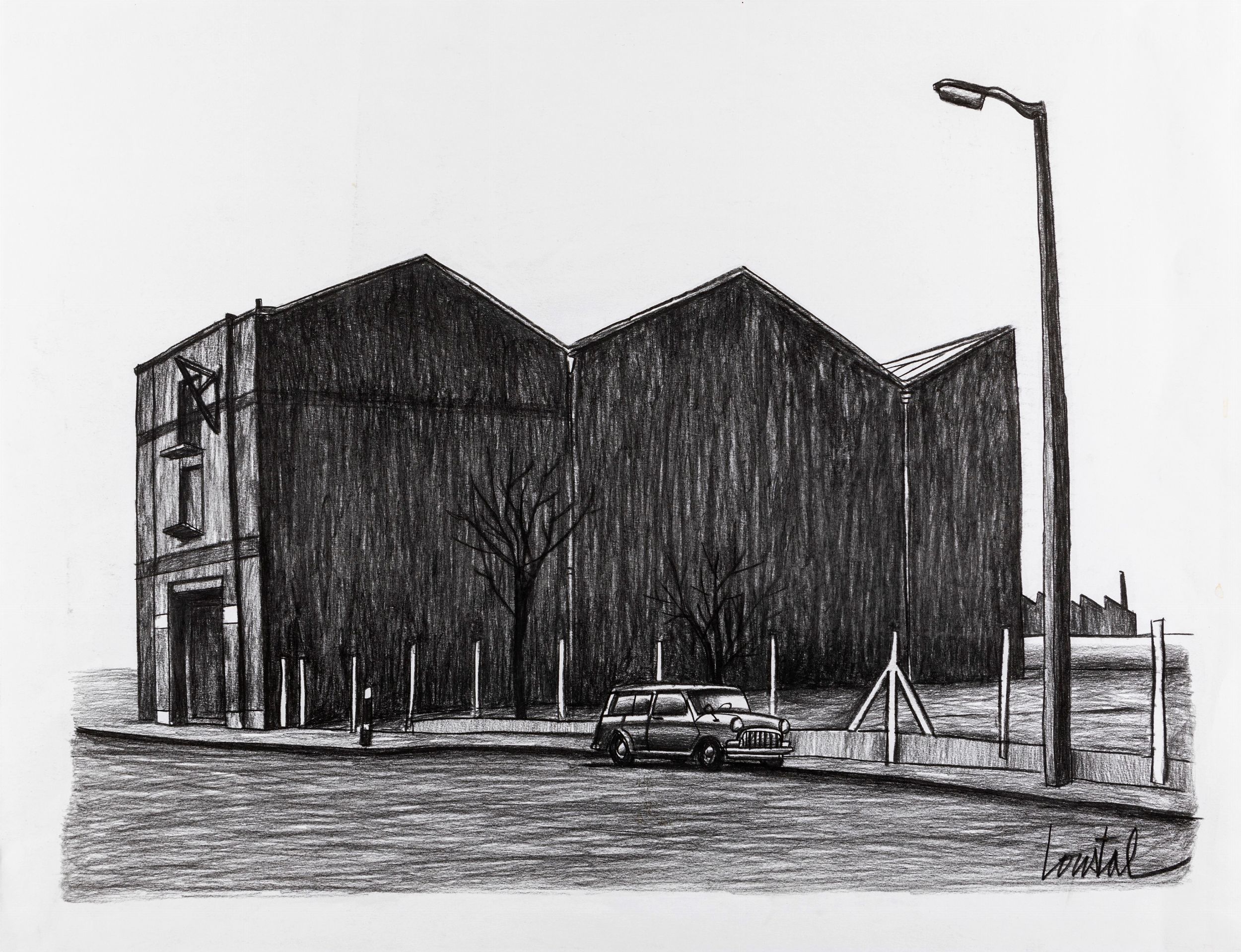 2007 Illustrazione originale realizzata da Loustal per il volume Attraverso la città, edito da Tricromia Illustrator's Int. nel 2007. Tra gli autori di maggior successo in Francia, Loustal si caratterizza nel mondo della nona arte e dell'illustrazione traendo ispirazione dalla pittura (David Hockney) e dal cinema (Wim Wenders). Grazie alla riscoperta del carboncino Loustal ha ridotto a pochi toni di grigio l'espressione di questo strumento antico disegnando condomini, fabbriche dismesse, depositi, inerti ma vivi, ai quali il carboncino restituisce la densità, il peso, la storia. Città silenziose, depositi di storie latenti da immaginare, sagome consumate ritagliate dal contesto urbano, fantasmi metropolitani che prendono corpo, spessore, volume. Il fascino di questi edifici deriva dal mistero del loro passato, dalla solitudine rispetto al resto della città e ai suoi abitanti. Firmata.