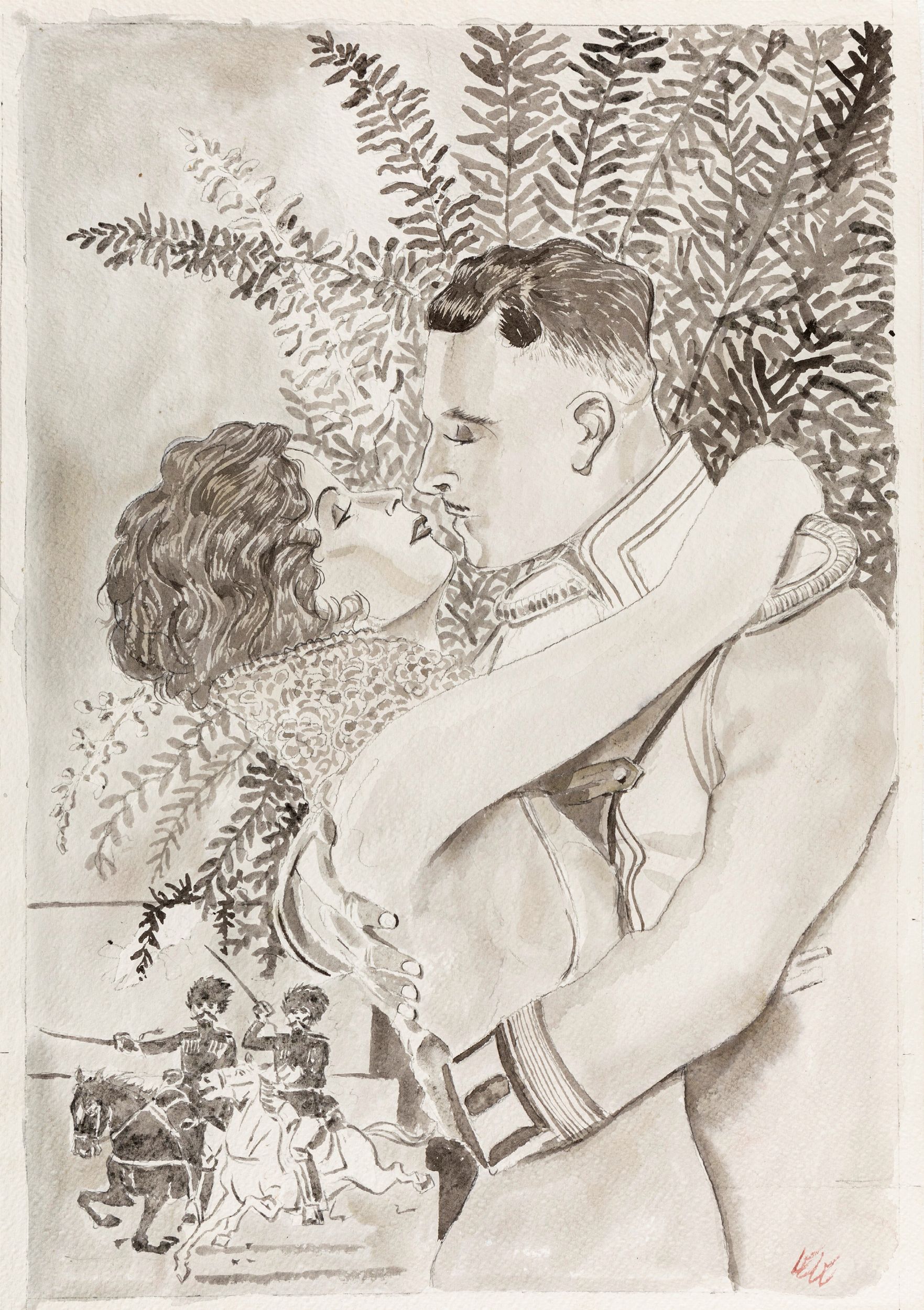 acquerello su cartoncino, 35 x 50 cm 2011 Illustrazione originale realizzata da Vianello per Bacinema, progetto collettivo curato dalla Galleria Tricromia di Roma chiedendo ai più importanti illustratori italiani di omaggiare i grandi baci della storia del cinema, qui vediamo Greta Garbo e Fredric March. Opera pubblicata nel catalogo Bacinema edito da Tricromia nel 2011. Firmata.