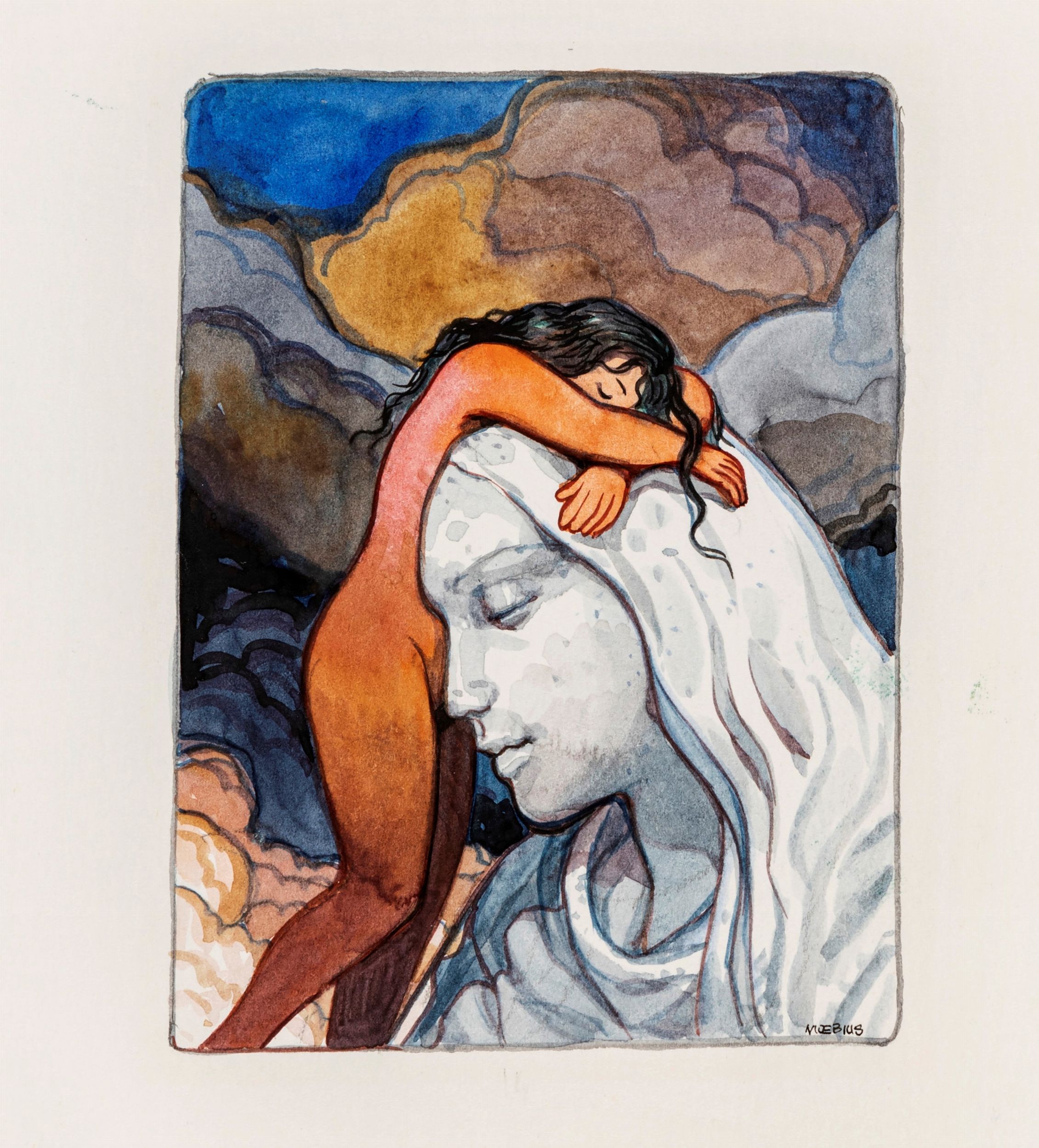 acquerello su cartoncino, 13 x 14 cm 1995 Illustrazione originale realizzata da Moebius per Ballate di François Villon, edita per la prima volta in Francia da Vertige Graphic nel 1995 e successivamente in Italia da Nuages nel 1996. Come un miniaturista medievale Moebius presenta in una nuova luce la ricchezza, la complessità ed il mistero della poesia di Villon, la sua arte visionaria si sposa con una delle personalità tra le più sfuggenti, ambigue e enigmatiche dell’intera storia della letteratura. Di grande rarità le opere ad acquerello del maestro francese. Firmata.