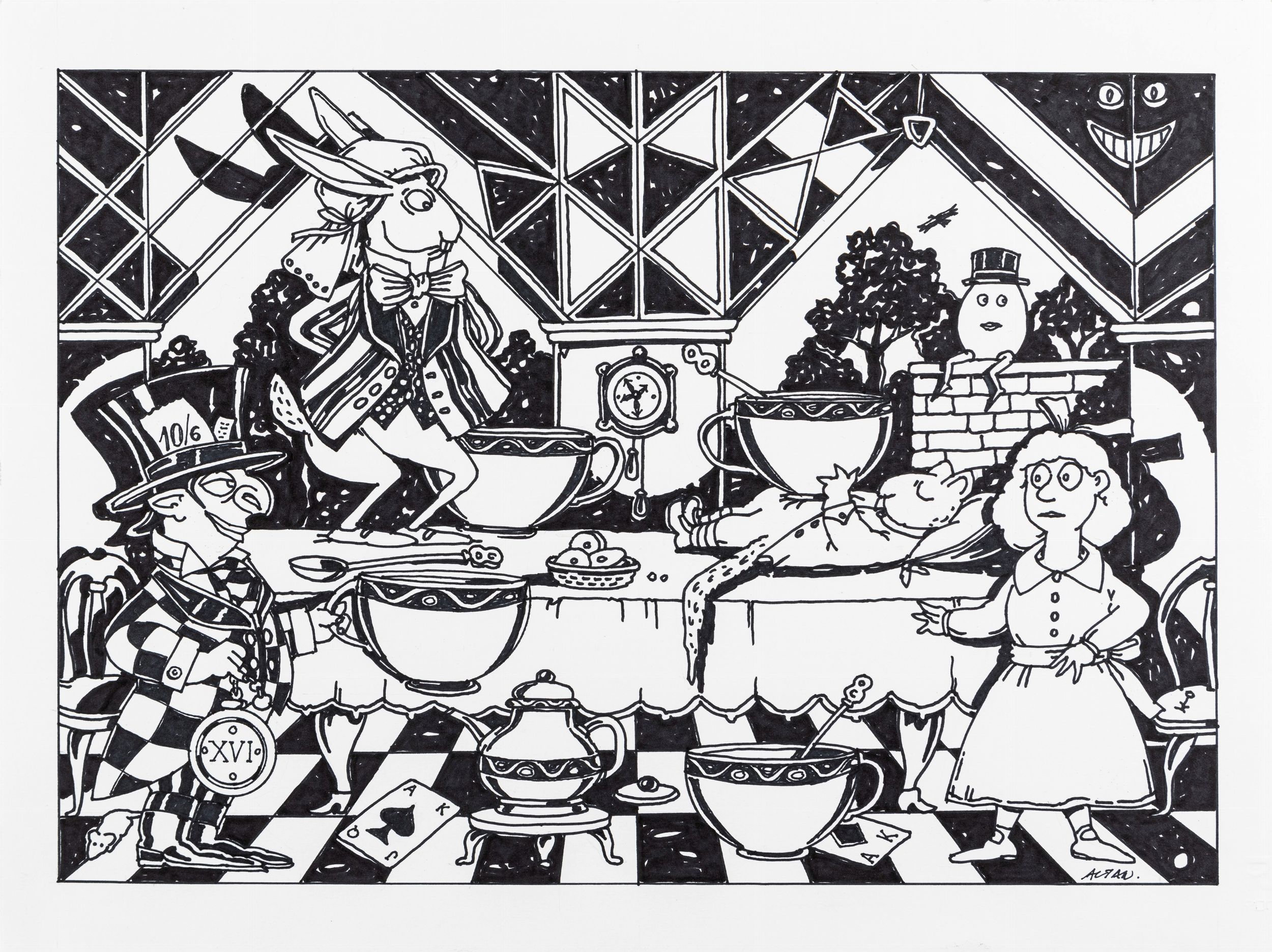 matita e pennarelli su cartoncino, 44 x 33 cm 2016 Illustrazione originale realizzata da Altan in occasione della mostra Il tè di Alice tenutasi nella galleria Nuages di Milano nel 2016. Opera pubblicata sull'inserto La Lettura del Corriere della Sera il 13 novembre 2016, successivamente sul catalogo della mostra L'illustrazione racconta: la collezione Cereda a pag. 60, edito dalla Fondazione Peano nel 2022. Firmata.