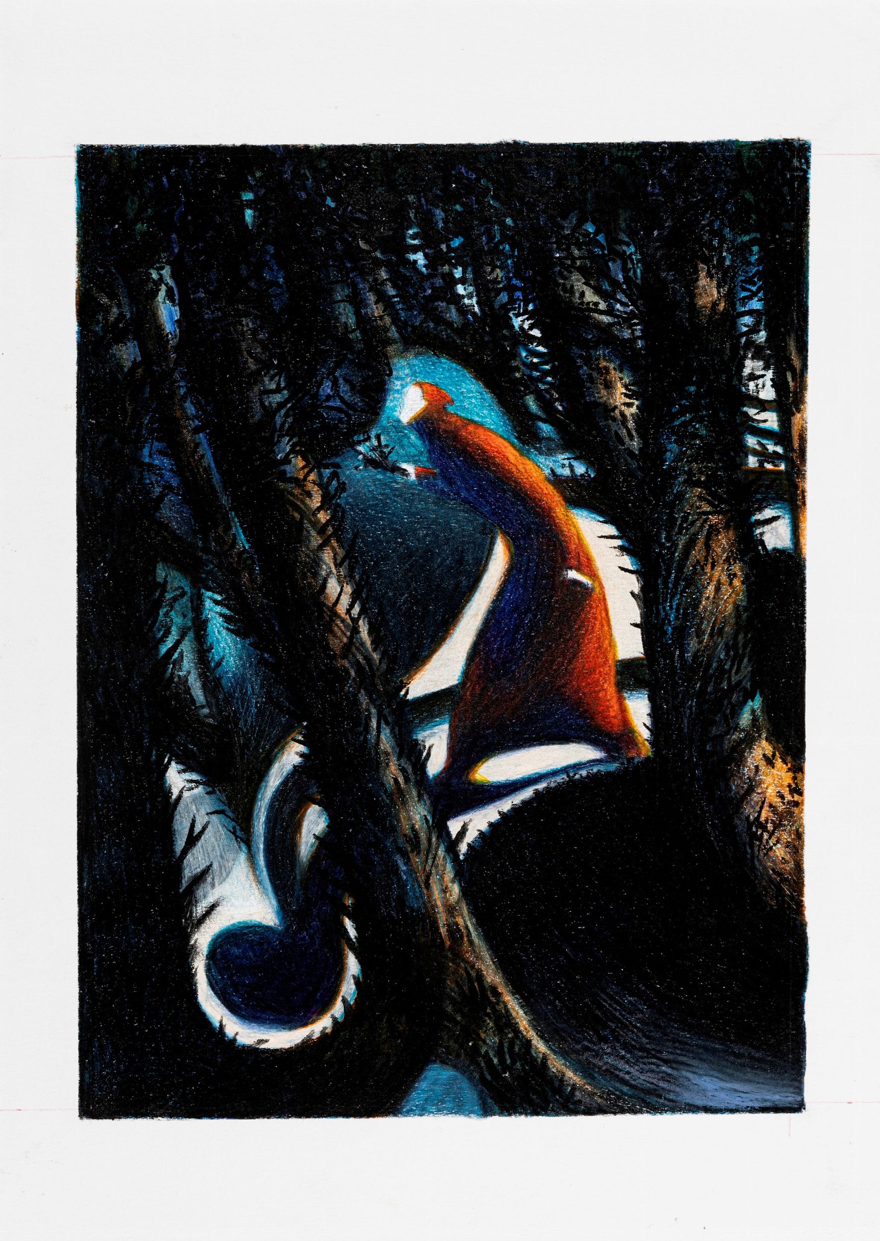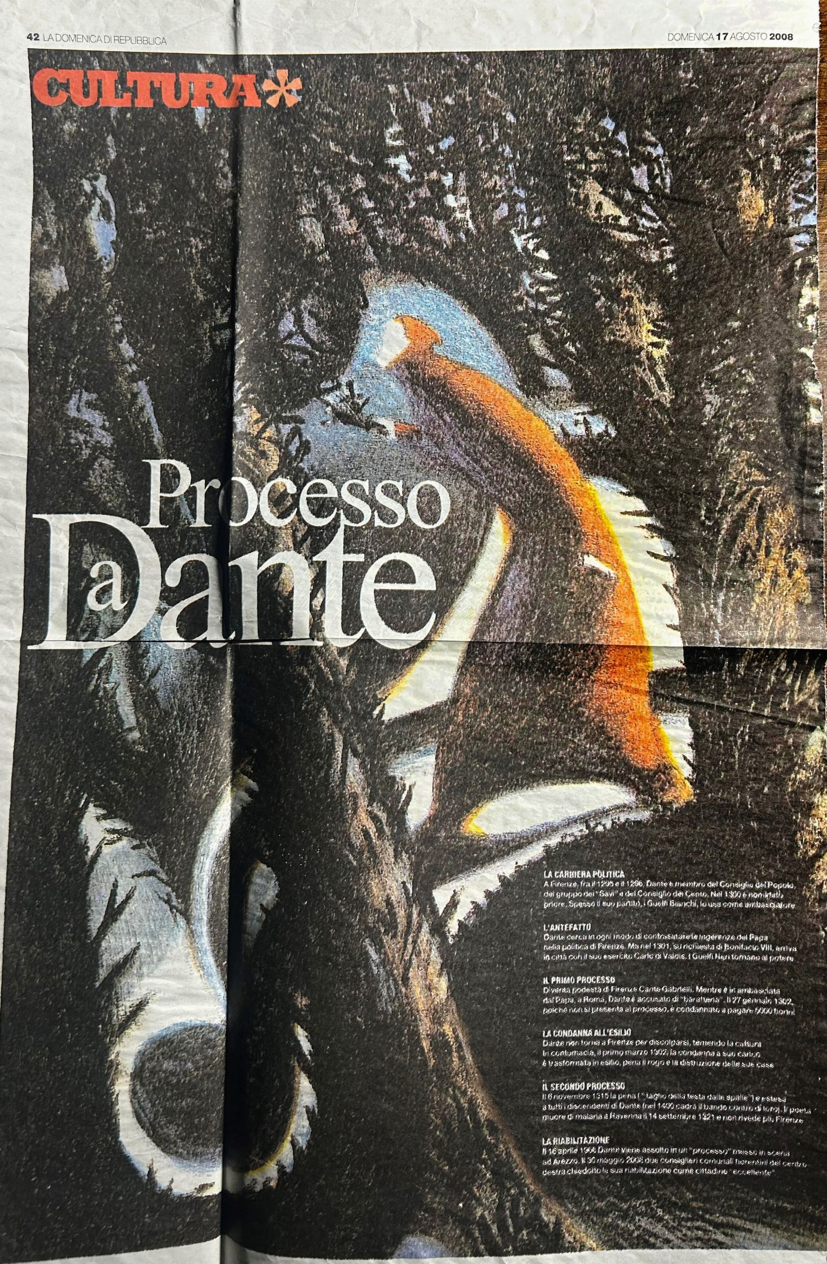 1999 Illustrazione originale realizzata da Mattotti per la sua celeberrima interpretazione dell'Inferno dantesco edito per la prima volta nel volume La Divina Commedia - Inferno dalle edizioni Nuages nel 1999. L'immagine più iconica dell'intera opera, l'incipit del primo canto dell'Inferno e, per estensione, dell'intero poema: Nel mezzo del cammin di nostra vita / mi ritrovai per una selva oscura, / ché la diritta via era smarrita. << Mattotti s’è tuffato nella Commedia per ciò che prima di tutto essa è: un libro di avventure. L’ha letta come ci chiede di leggerla uno dei suoi più ispirati navigatori, Jorge Luis Borges: con abbandono e con ingenuità, «con la fede d’un bambino». È con la fede di un bambino che Mattotti s’è lanciato nell’Inferno: recuperando fantasmagorie smarrite negli sgabuzzini onirici dell’infanzia, privilegiando l’incubo contro il simbolo, sguinzagliando l’occhio sulle orme di fantasmi streghe vampiri satanassi >> (Jonny Costantino). Firmata al retro.