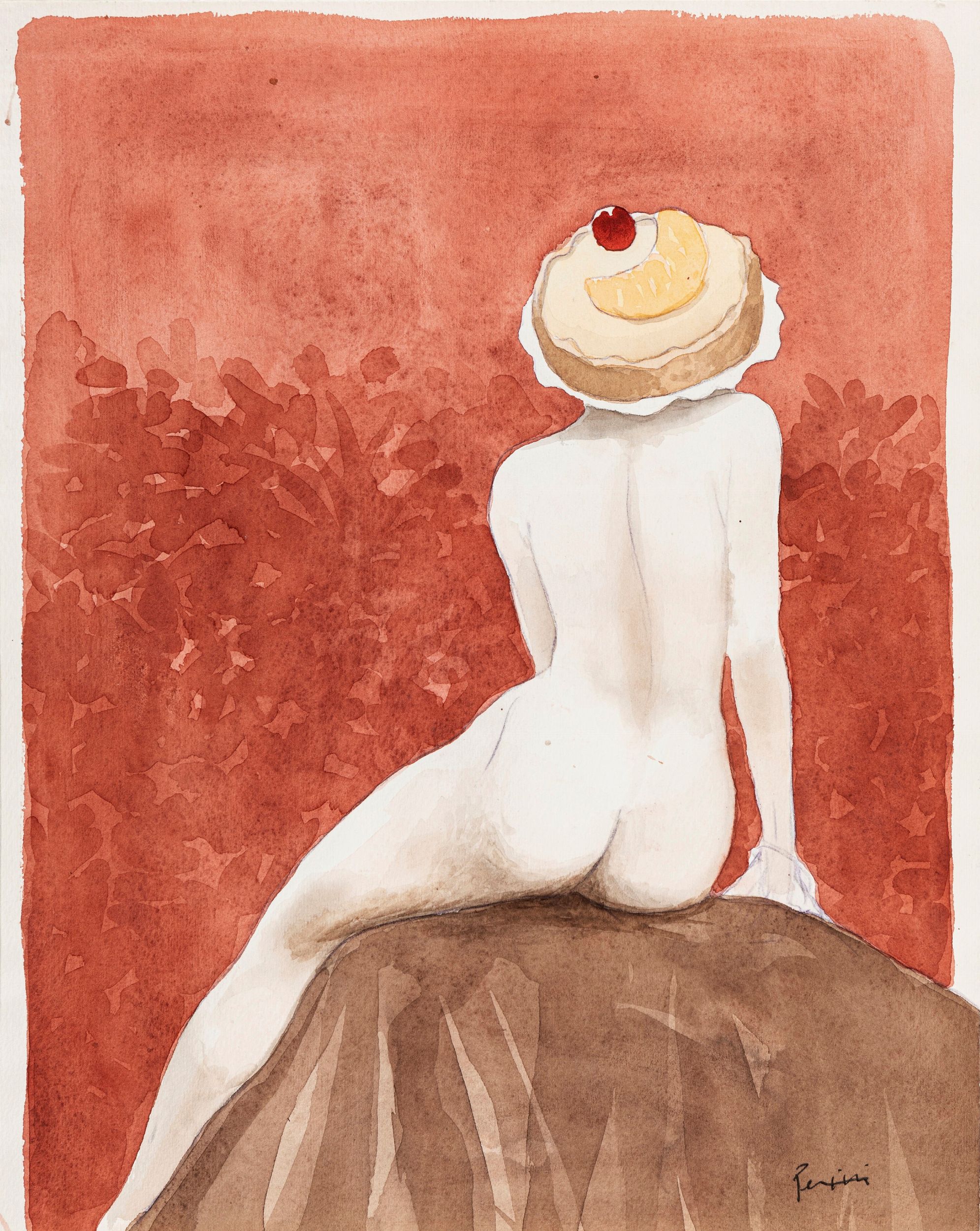 1997 Illustrazione originale realizzata da Perini, titolata al retro: mandarino, crema pasticcera e carne fresca. Tra i fondatori del Male, disegnò per riviste satiriche e quotidiani come Frigidaire, l'Unità, La Repubblica, L'Espresso e Alterlinus. Lavorò anche come scenografo per Roma di Federico Fellini e Salomè di Carmelo Bene. Nel 1986 con Roland Topor e Pablo Echaurren fondò il movimento Frou-Frou. Firmata.