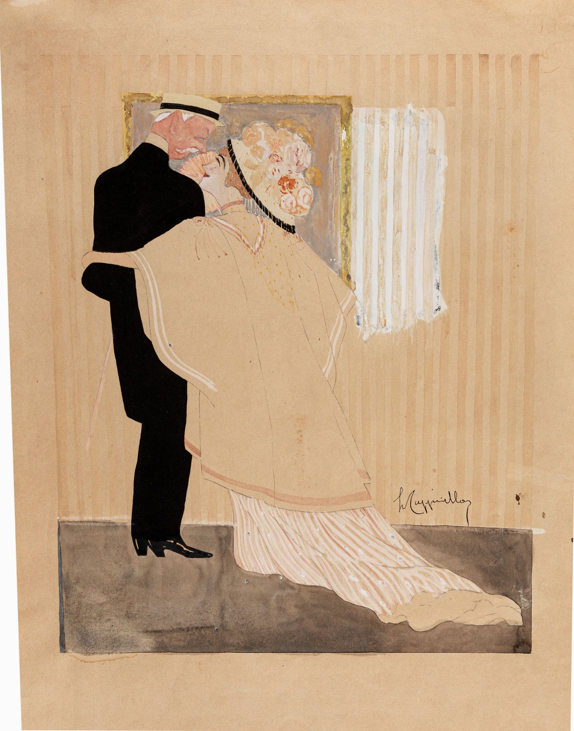 china, acquerello e tempera su cartoncino, 31,5 x 42 cm primi del '900 Illustrazione originale realizzata da Cappiello nei primi anni del '900. Riconosciuto come uno dei padri del moderno cartellonismo pubblicitario, Cappiello conosce rapidamente il successo a Parigi come caricaturista collaborando con varie riviste tra cui Le Sourire, Le Figaro e Le journal, approdando poi alla cartellonistica, prima in Francia e poi in Italia, dettando il suo stile per oltre vent'anni. Un piccolo strappo e un foro al margine destro. Firmata.