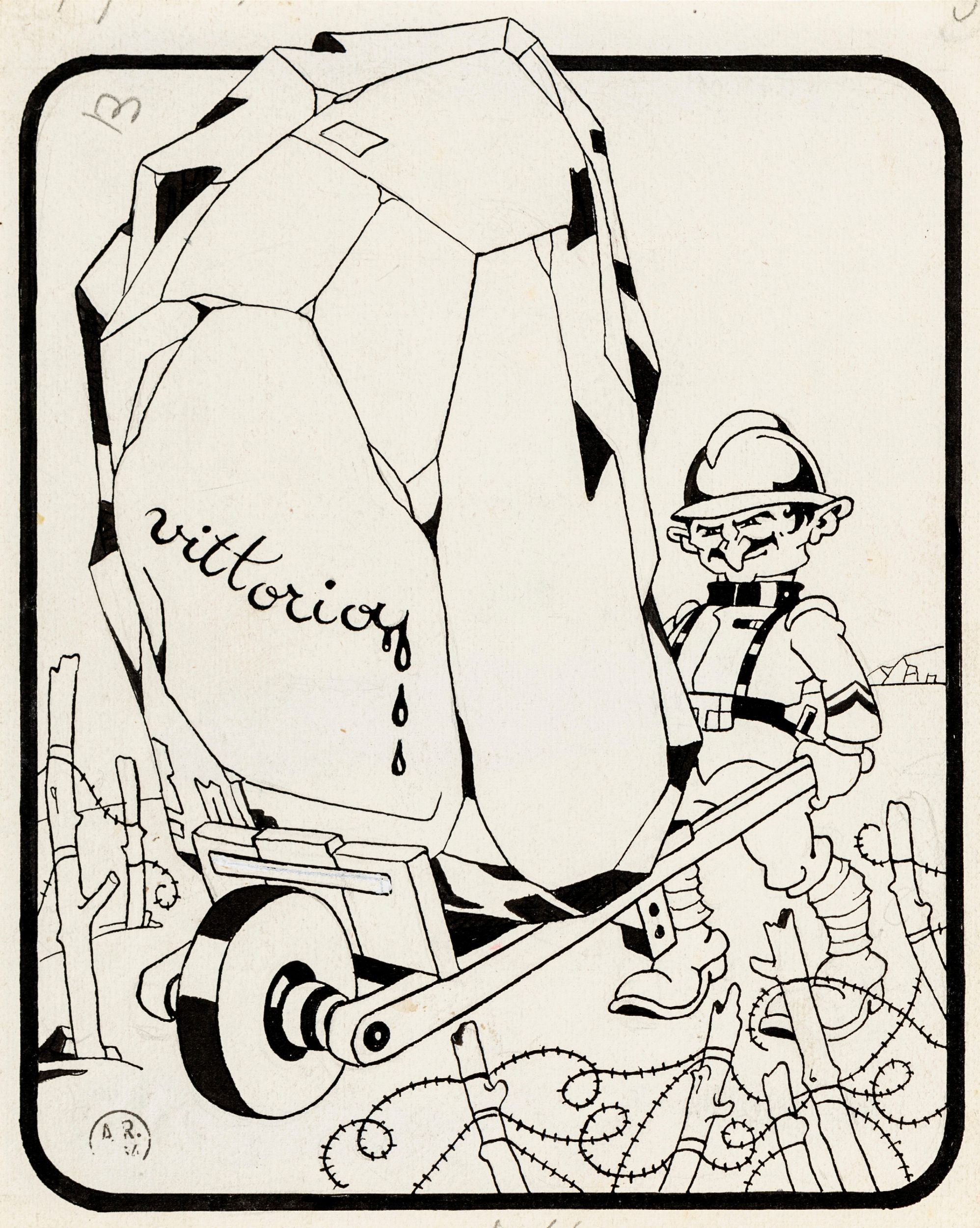 matita e china su cartoncino, 16 x 20 cm 1918 Illustrazione originale realizzata da Rubino per la singolare rubrica Massime del Caporal C. Piglio edita su La Tradotta n. 23 del 1 Febbraio 1919. Dal 1918 al 1919 il sottotenente Rubino fu redattore de La Tradotta, giornale della Terza Armata, distribuito ai soldati durante gli ultimi mesi del primo conflitto mondiale. Un'opera da museo ed un autentico pezzo di storia del nostro paese e dell´illustrazione italiana. Recante il timbro d'archiviazione.