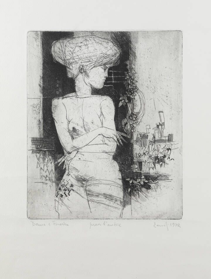 56x42 2 foglio 30x23 acquaforte prova d'artista Opera firmata e datata in basso a destra intitolata in basso a sinistra e iscritta prova d'autore in basso al centro (a matita sul foglio) Piccola macchia in basso a destra sul foglio e lieve usura della carta.