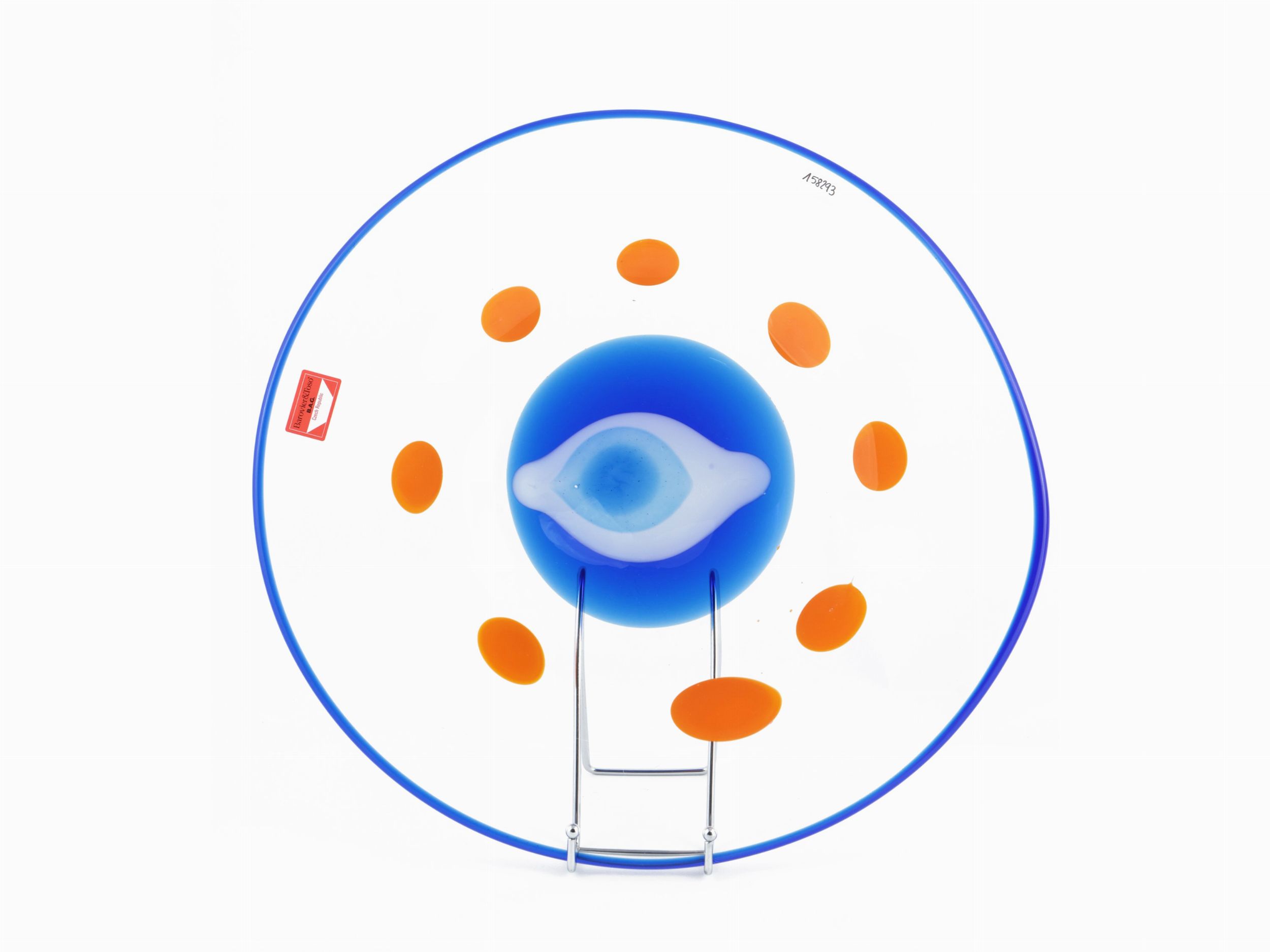 Repubblica Ceca, anni '80/90 in vetro trasparente con occhio centrale stilizzato in vetro lattimo e inclusioni color arancio, bordo blu cobalto applicato a caldo. Reca etichetta cartacea.