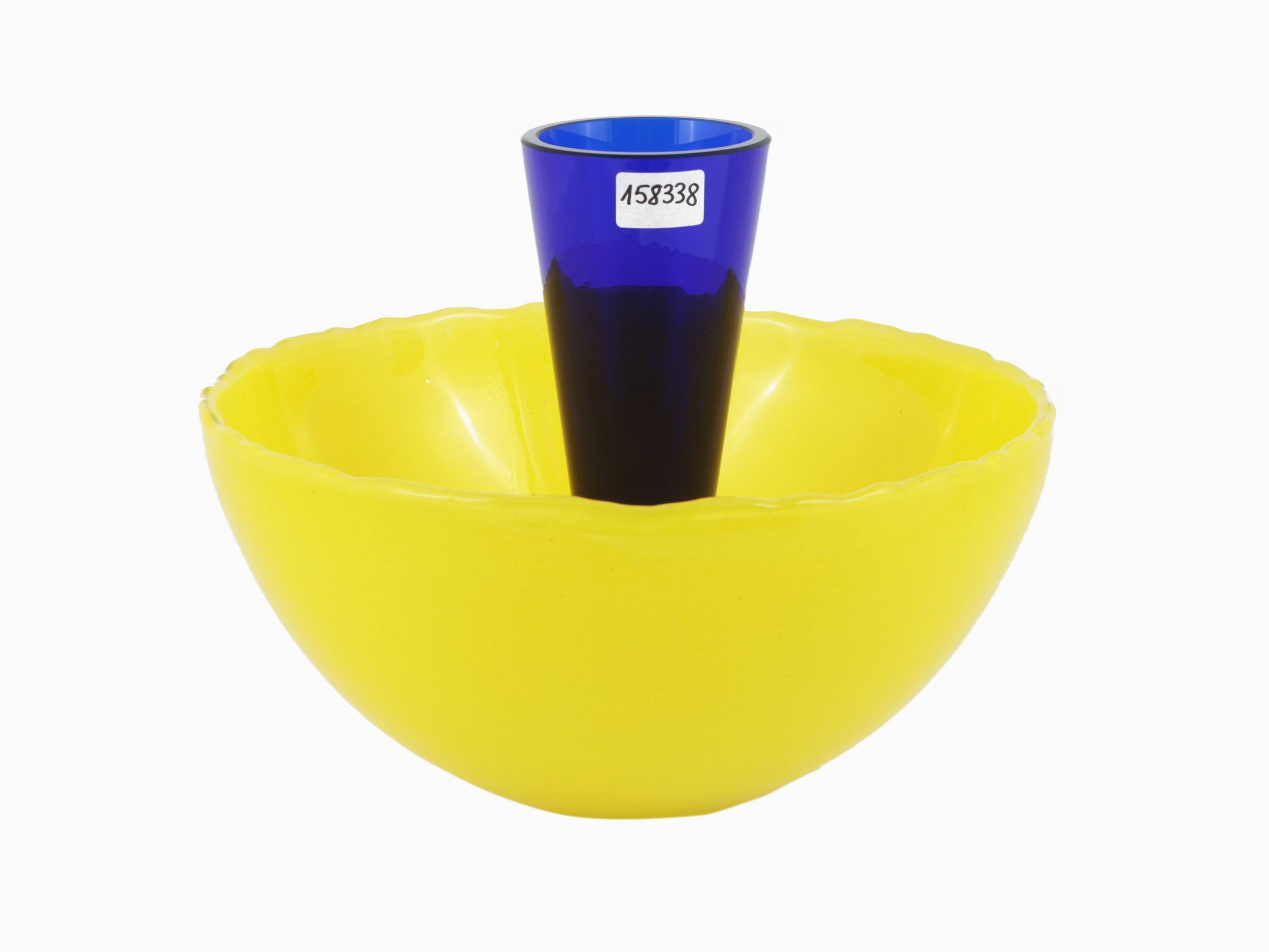 Repubblica Ceca, anni 80/90 in vetro giallo limone con applicazione centrale a caldo di piccolo vaso portafiori blu. Reca etichetta cartacea.