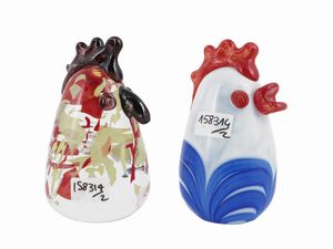 h cm 11 (2) Repubblica Ceca, anni 80/90 in vetro policromo applicazione a caldo di creste, occhi e becco. Recano [..]