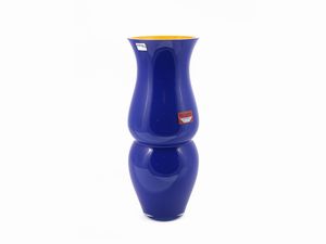 h cm 36 Repubblica Ceca, anni 80/90 in vetro incamiciato blu e giallo con strozzatura sul corpo. Firmato. Reca [..]