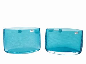 h cm 15x22,5x10 (2) Repubblica Ceca, anni 80/90 in vetro azzurro con lavorazione incisa sul corpo di entrambi. [..]