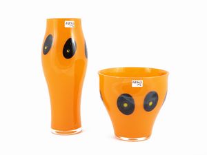 h da cm 15 a cm 26,5 (2) Repubblica Ceca, anni '80/90 in vetro incamiciato arancio con inclusioni policrome astratte. [..]