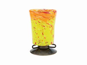 h cm 19, diam cm 28 Repubblica Ceca, anni 80/90 in vetro arancio con applicazione a caldo di sfera verde. Reca [..]