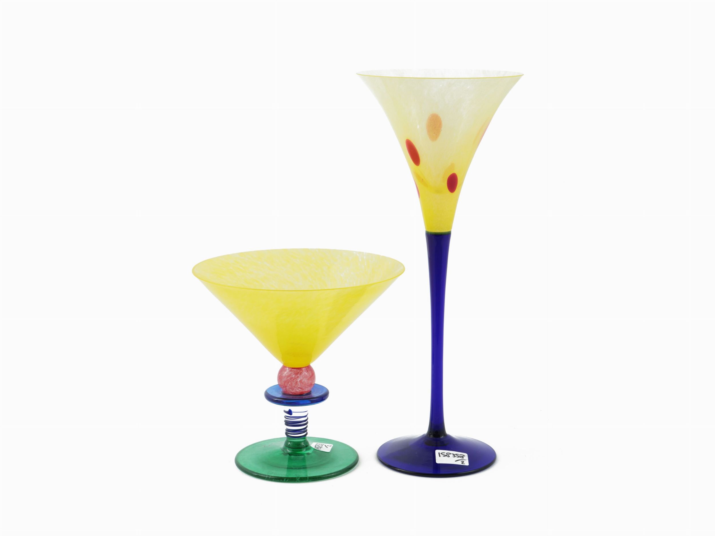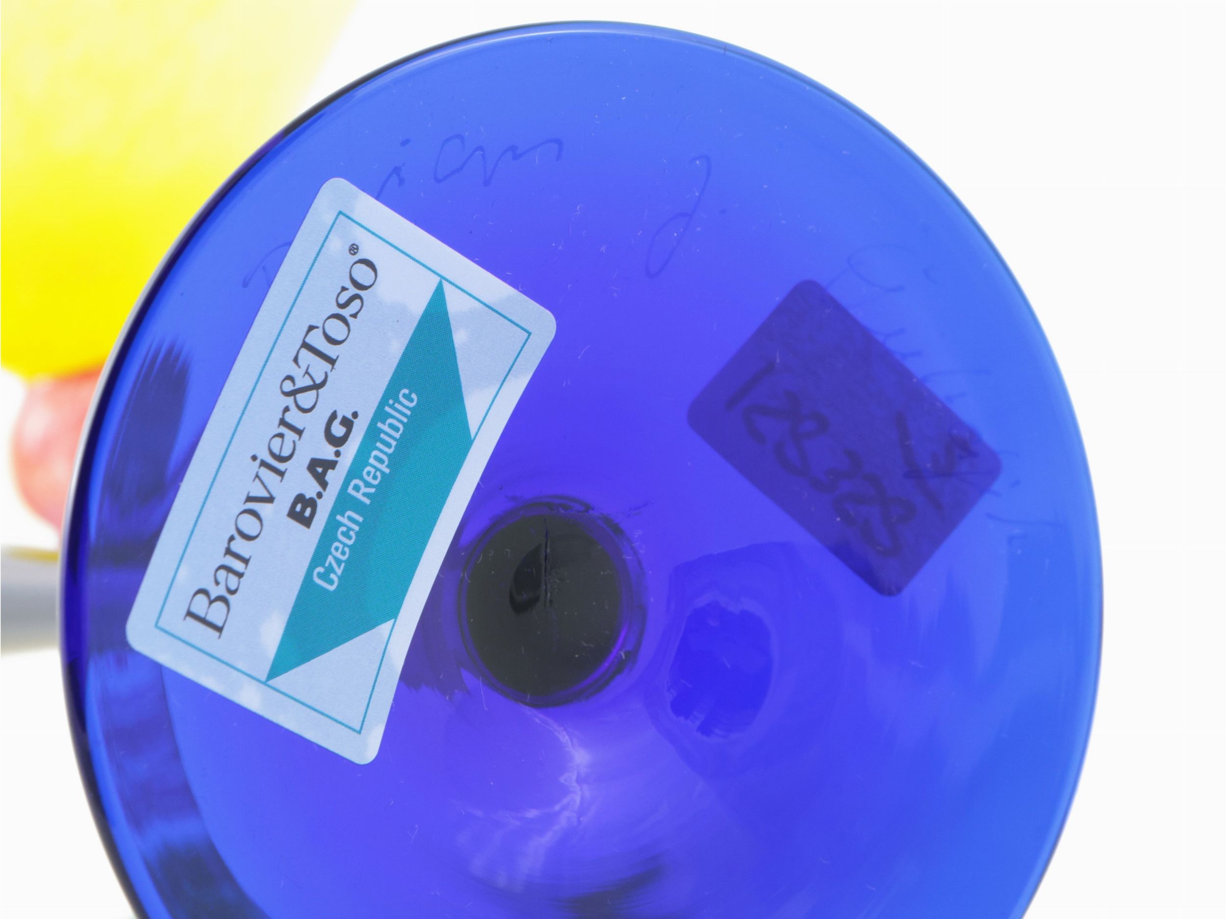 Repubblica Ceca, anni 80/90 in vetro soffiato con applicazioni policrome a caldo di vari elementi. Recano etichetta cartacea.