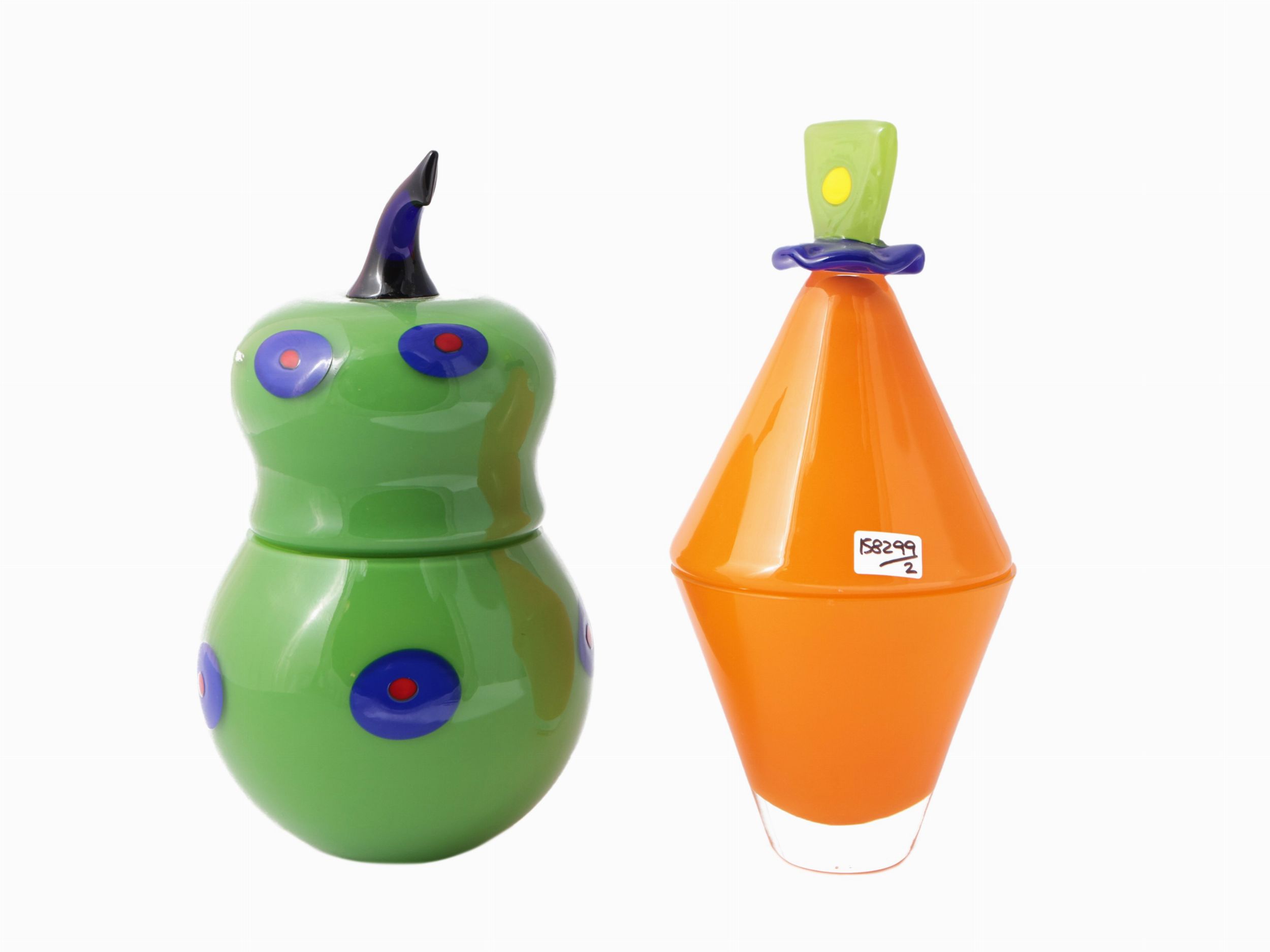 h da cm 24 a cm 25 (2) Repubblica Ceca, anni '80/90 in vetro incamiciato il primo a forma di frutto verde con inclusioni in vetro policromo e picciolo in vetro blu applicato a caldo il secondo color arancio vivo con applicazioni a caldo. Recano etichetta cartacea.