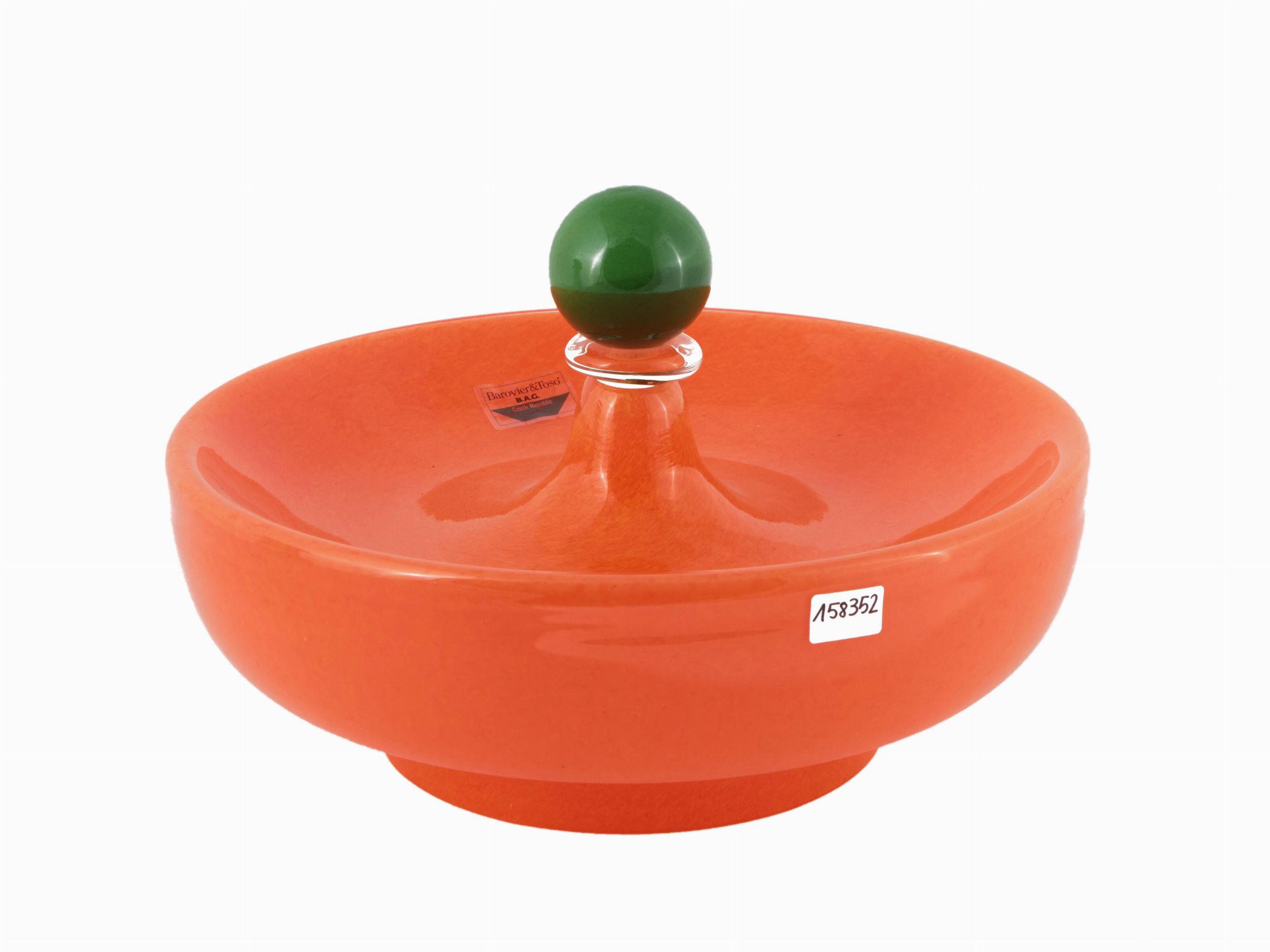 Repubblica Ceca, anni 80/90 in vetro arancio con applicazione a caldo di sfera verde. Reca etichetta cartacea.