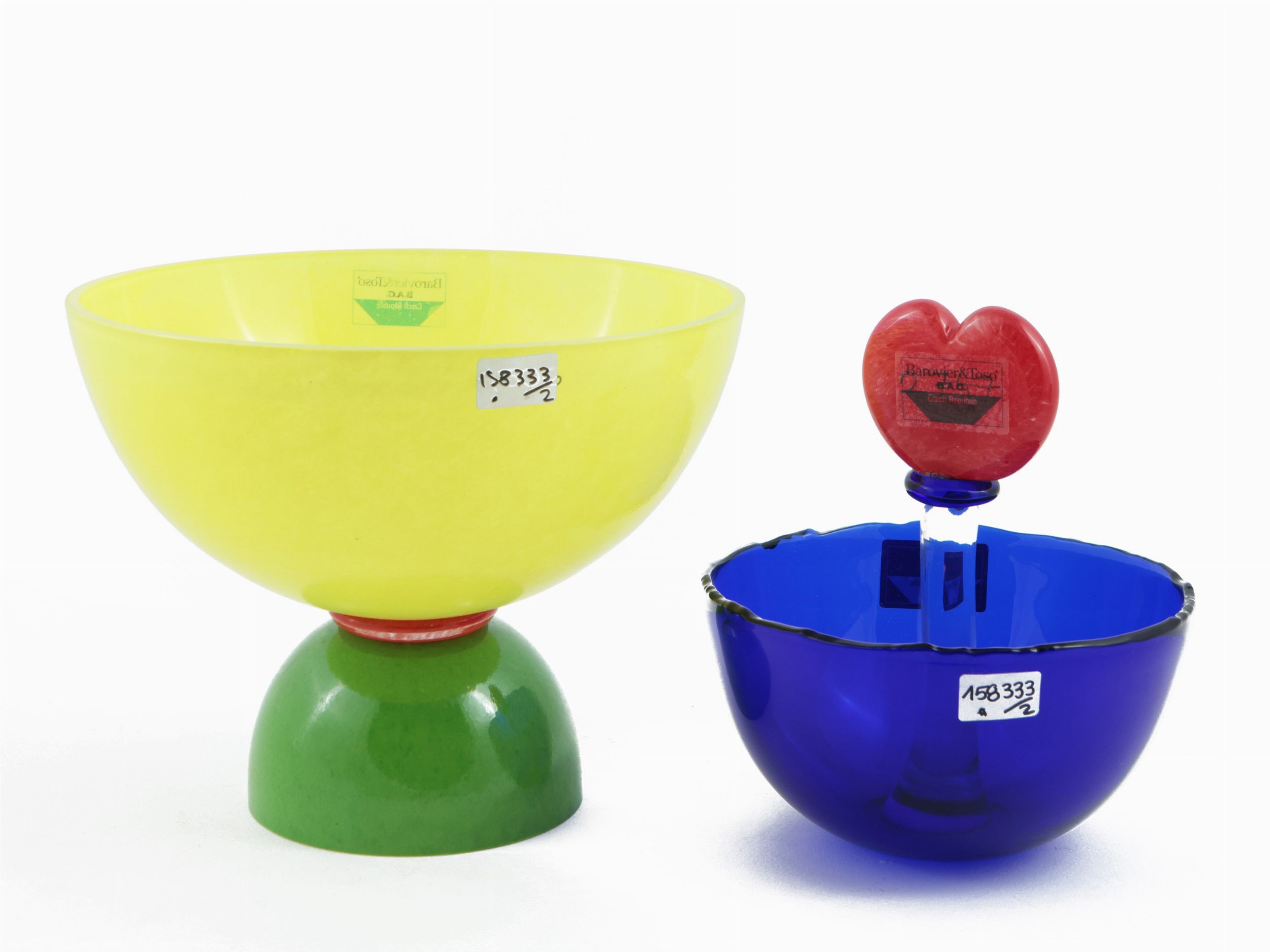 h da cm 15,5 a cm 16,5, diam da cm 16 a cm 20 (2) Repubblica Ceca, anni 80/90 la coppa in vetro giallo canarino con base verde prato congiunta da anello arancio la ciotola in vetro blu scuro con cuore rosso applicato a caldo. Recano etichetta cartacea.
