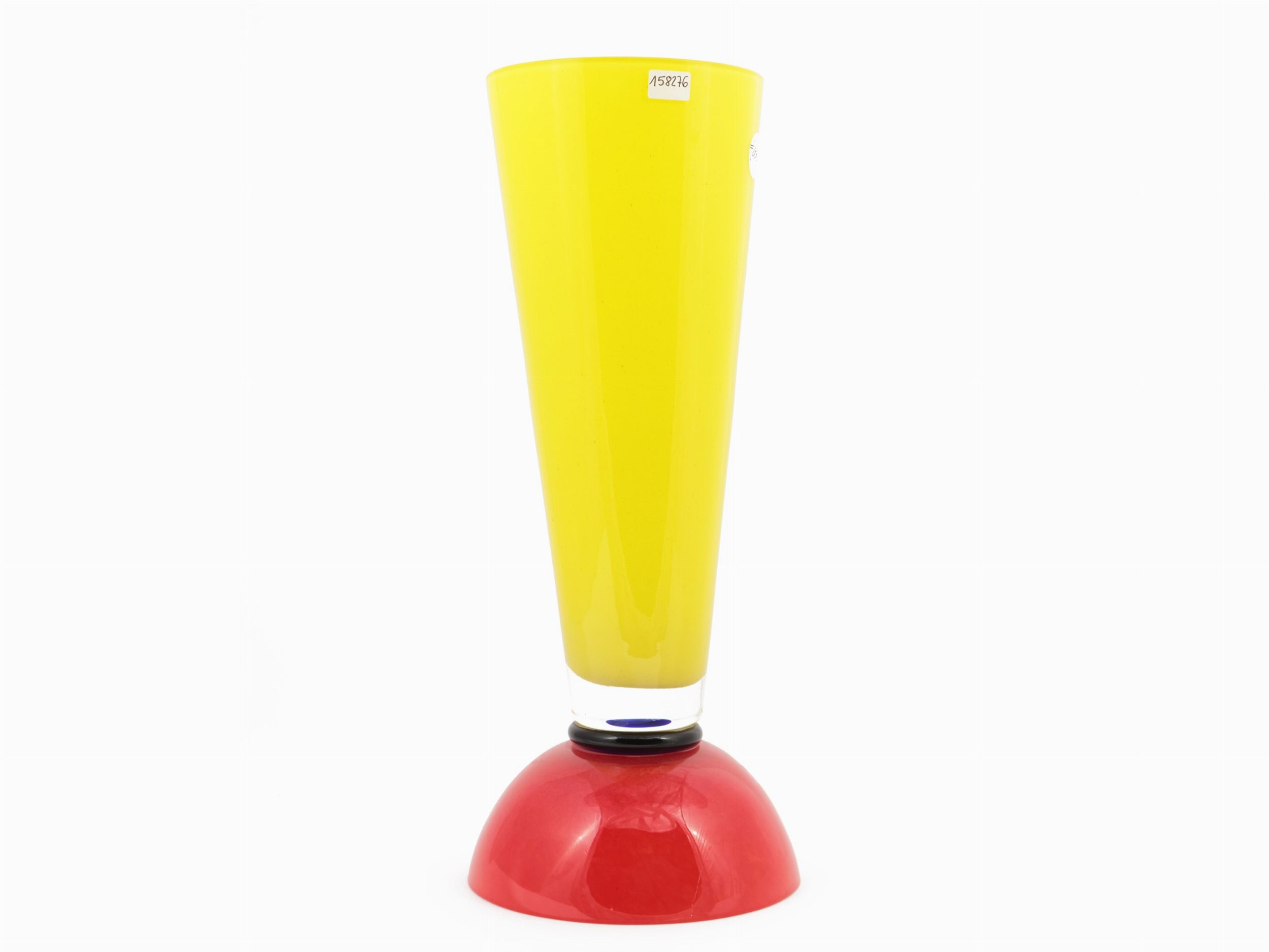 Repubblica Ceca, anni '80/90 in vetro giallo limone incamiciato con elemento decorativo in vetro nero a congiunzione, base arancio vivo brillante applicata a caldo. Reca etichetta cartacea.