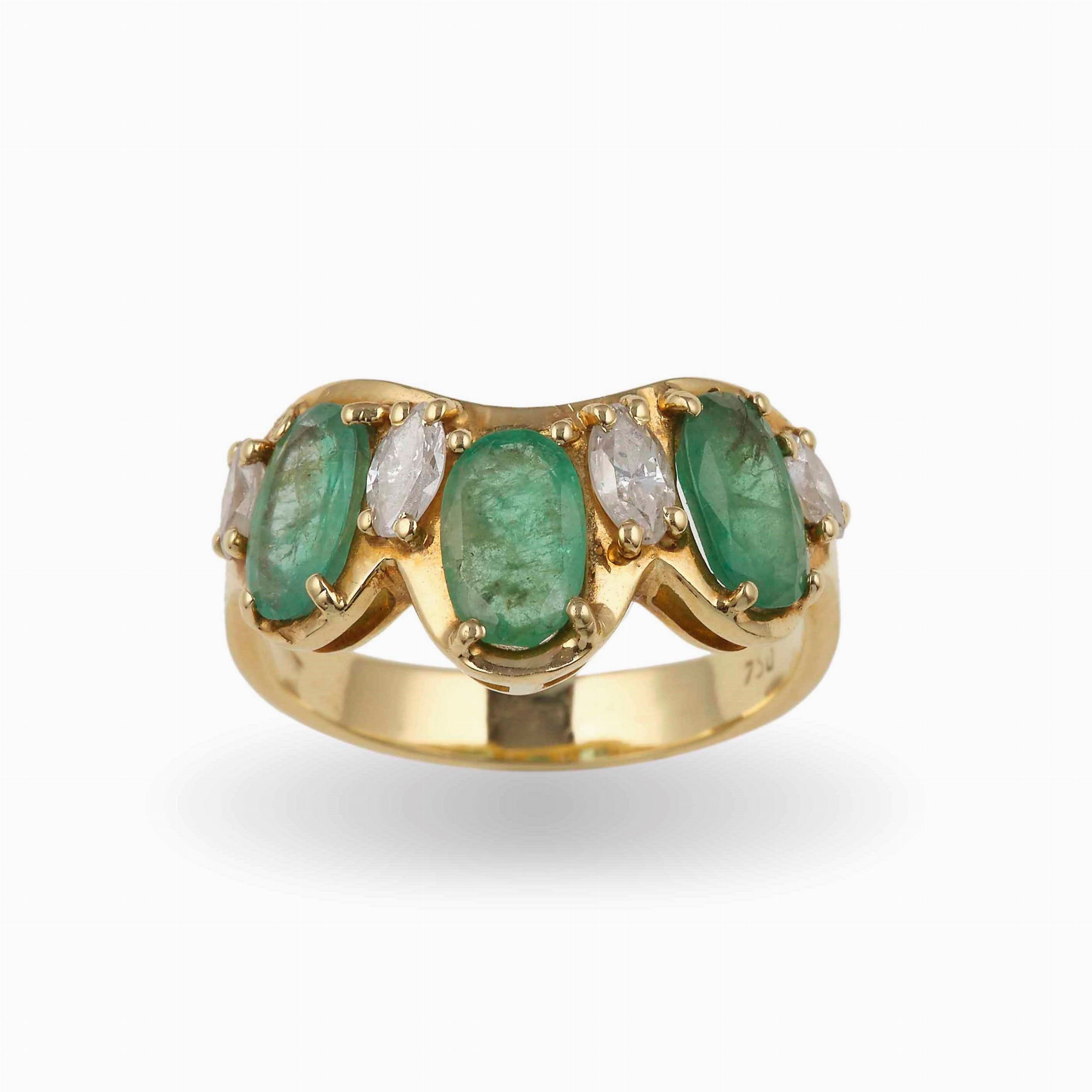 Anello con smeraldi taglio ovale e diamanti taglio a marquise