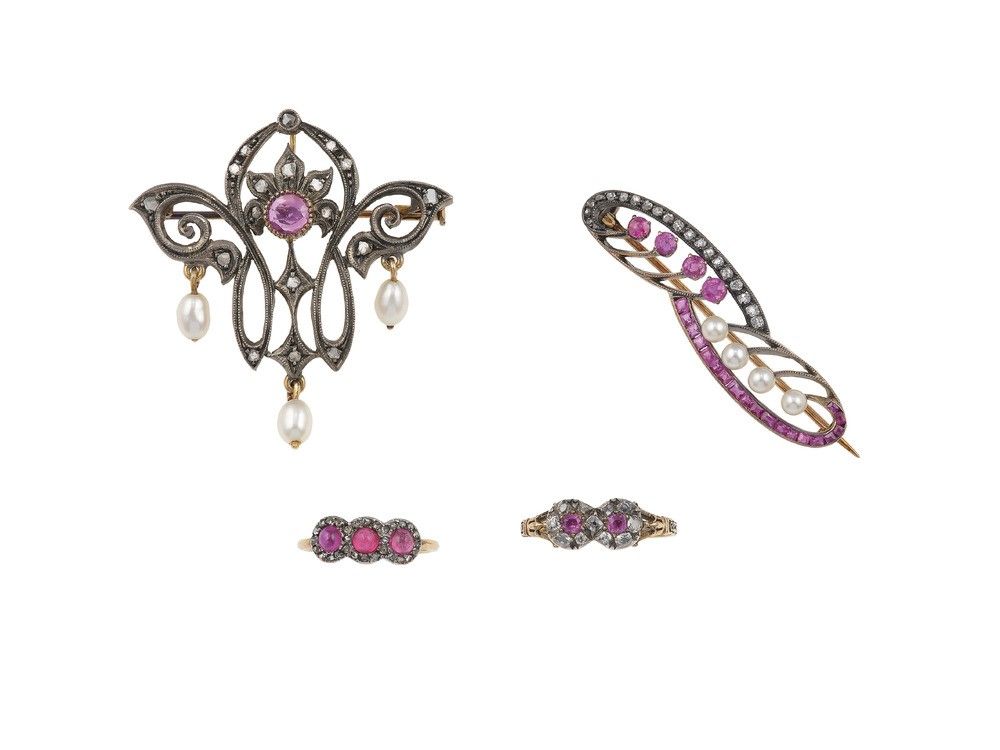 Lotto composto da due aneli e due spille con piccoli diamanti, rubini e perle co [..]