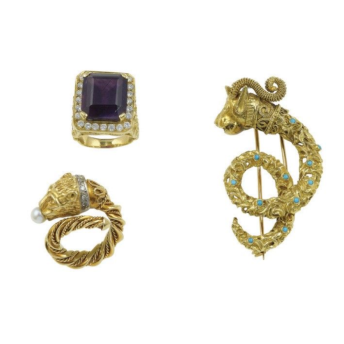 Lotto composto da due anelli con diamanti, ametista e perla ed una spilla