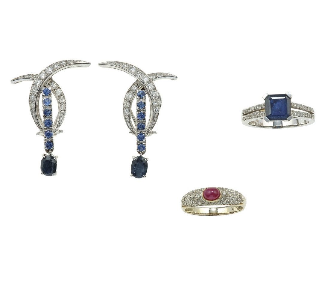 Lotto composto da due anelli ed un paio di orecchini con piccoli diamanti, rubino [..]