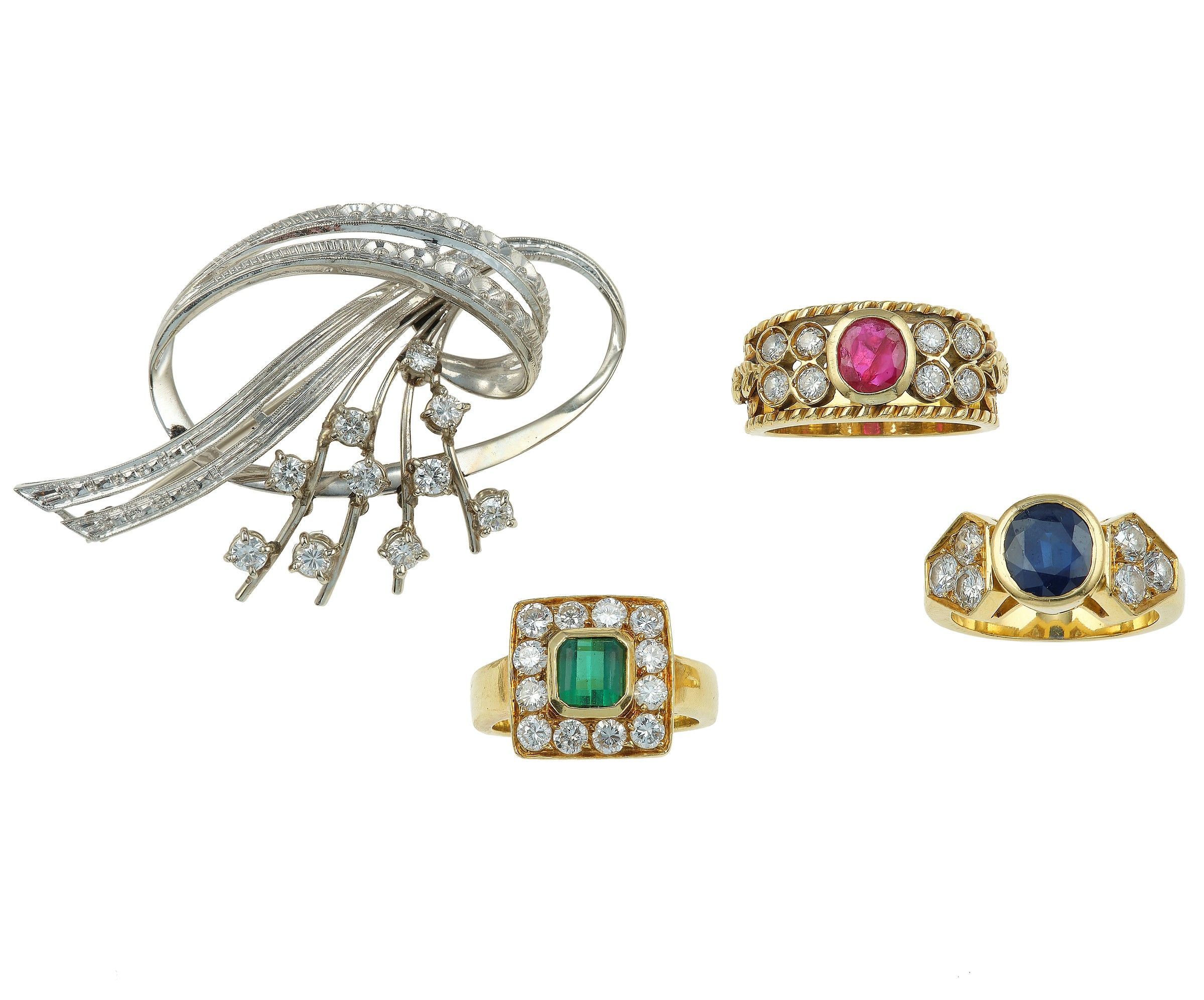 Lotto composto da tre anelli con rubino, zaffiro, smeraldo e diamanti ed una spilla [..]