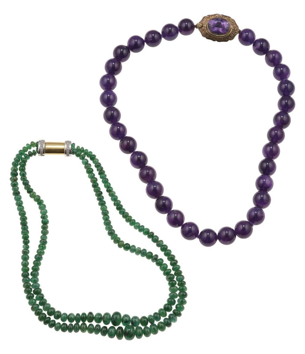 Lotto composto da una collana con boules di ametiste ed una collana con smeraldi