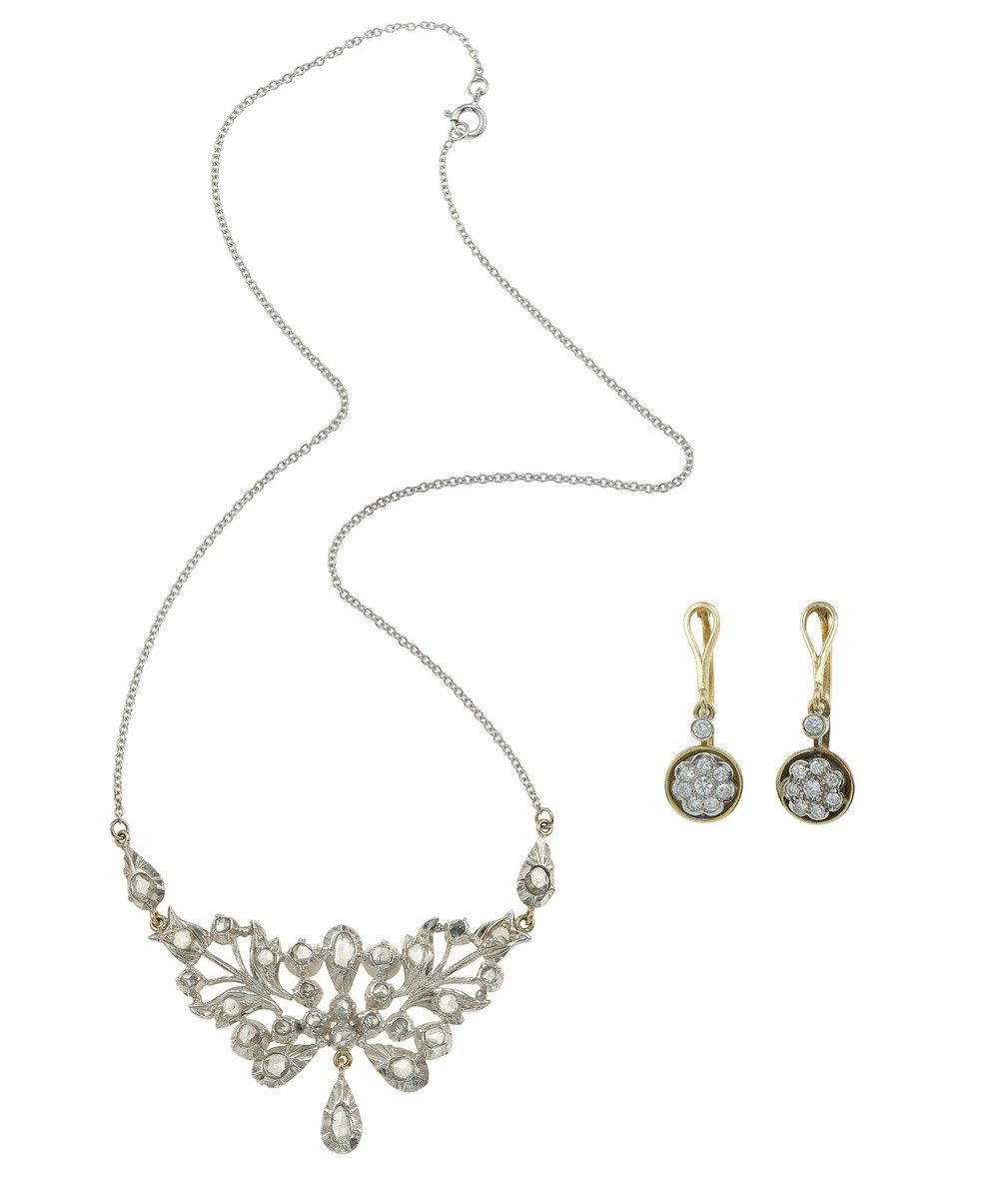 Lotto composto da una collana ed un paio di orecchini con rosette di diamanti e [..]