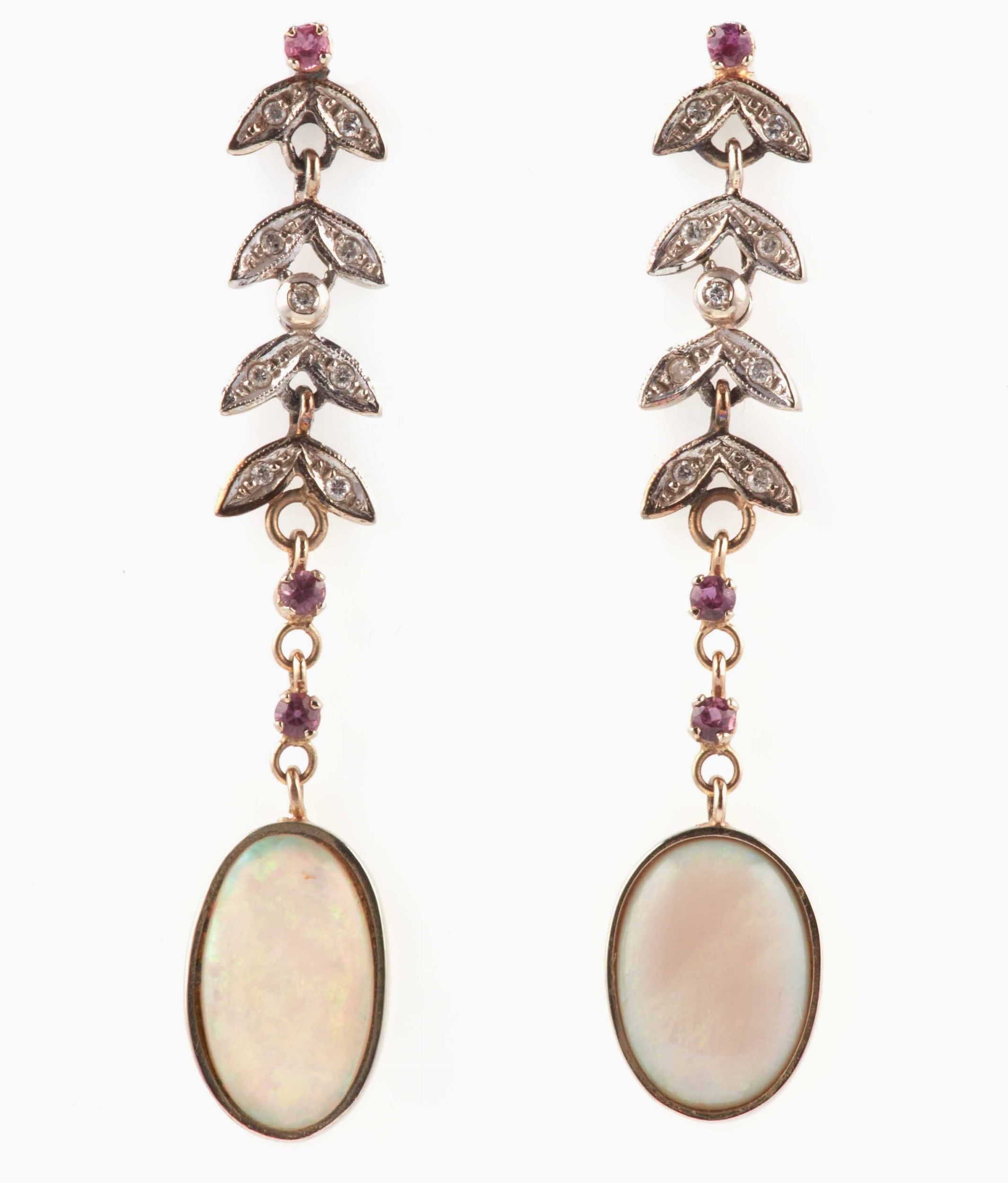 Orecchini pendenti con opali, piccoli diamanti e rubini