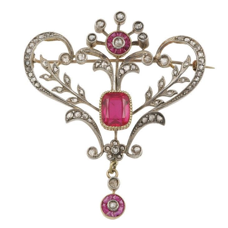Spilla con rubini sintetici e rosette di diamante