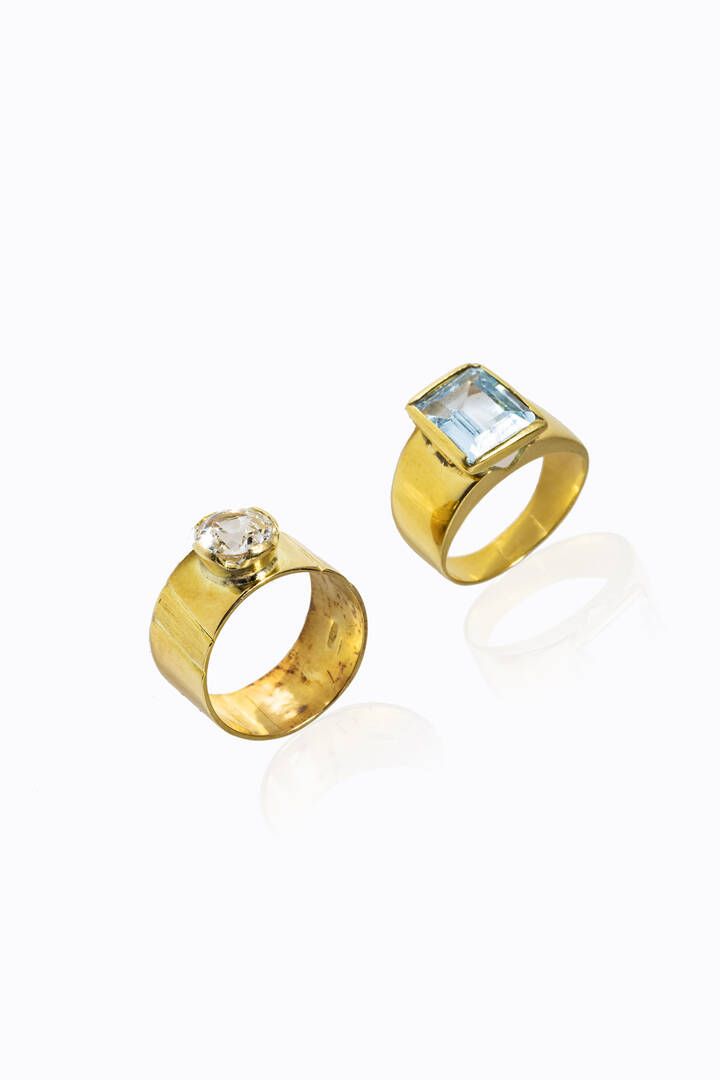 -in oro giallo al centro topazio taglio ottagonale. Peso gr 7 0. Misura14 (54) -in oro giallo a fascia con al centro pietra bianca sintetica. Peso gr 8 3. Misura 17 (57)