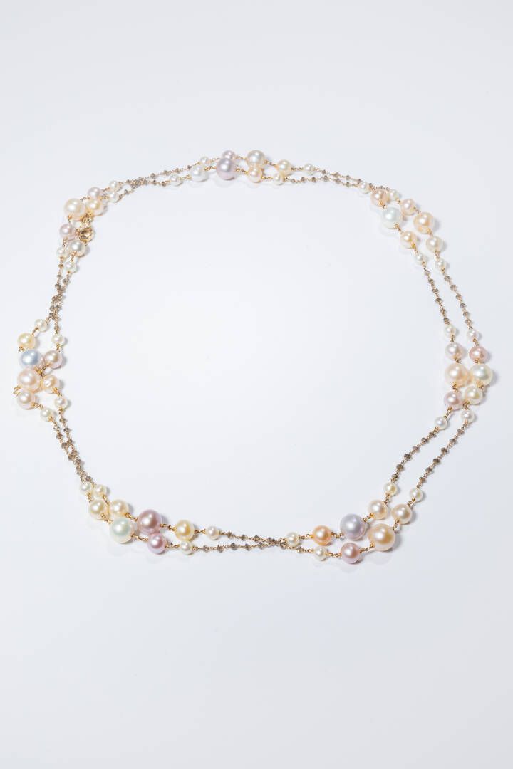 Lunghezza cm 128 in oro rosa con diamanti sfaccettati di colore brown per totali ct 10.79 ca e di colore bianco per totali ct 0 12 ca alternati a perle giapponesi nei toni del rosa e del grigio chiaro.