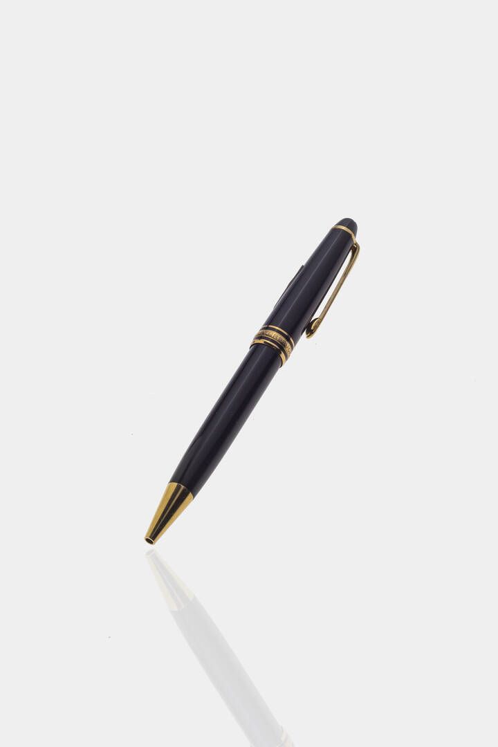 Penna a sfera marcata Montblanc serie Meisterstuck Cappuccio e corpo in resina nera con finiture color oro giallo.
