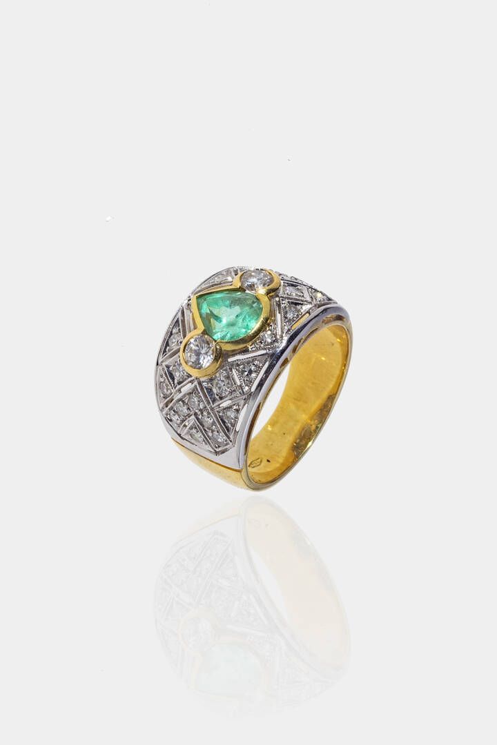 Peso gr 10 4 Misura 16 (56) in oro giallo e bianco a fascia anni '90 con al centro uno smeraldo taglio a goccia di ct 1 35 ca e diamanti taglio brillante e 8/8 per totali ct 0 63 ca