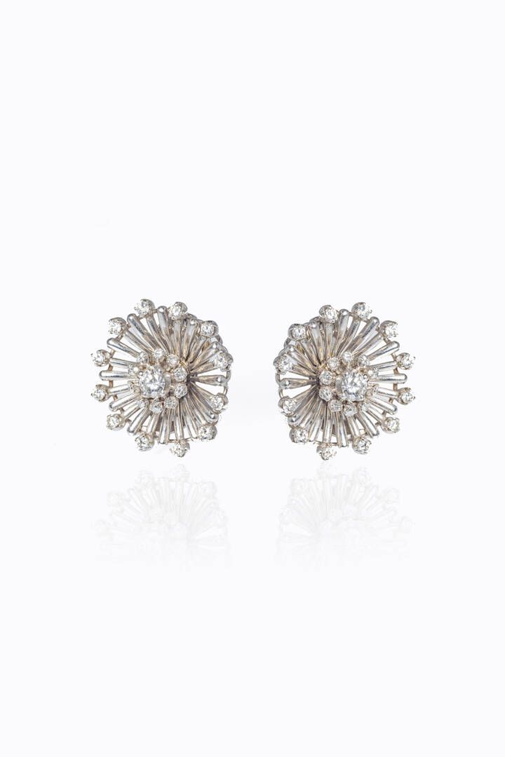 Peso gr 21 in platino di forma rotonda anni '50 lavorati a fiore con diamanti taglio brillante per totali ct 1 10 ca