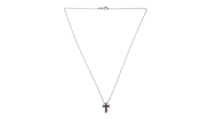 Peso gr 3 5 in oro bianco a forma di croce con diamanti taglio brillante per totali ct 0 10 ca e rubini taglio rotondo per totali ct 0 11 ca