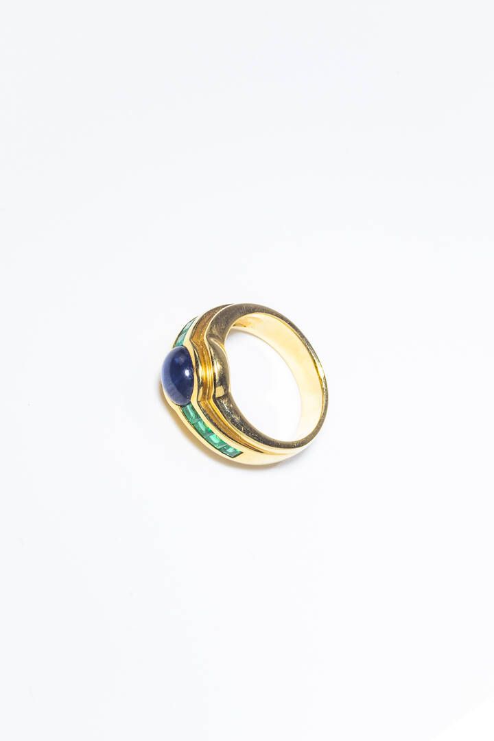 Peso gr 4 1 Misura 13 (53) in oro giallo al centro zaffiro cabochon di ct 1 77 ca ed ai lati smeraldi taglio carré per totali ct 0 72 ca