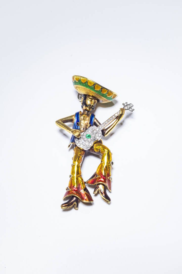 Peso gr 55 7 Cm 9x4 Spilla in oro giallo e bianco firmata Damiani serie i Suonatori a forma di suonatore di chitarra messicano in smalto policromo e diamanti taglio 8/8 per totali ct 0 80 ca.