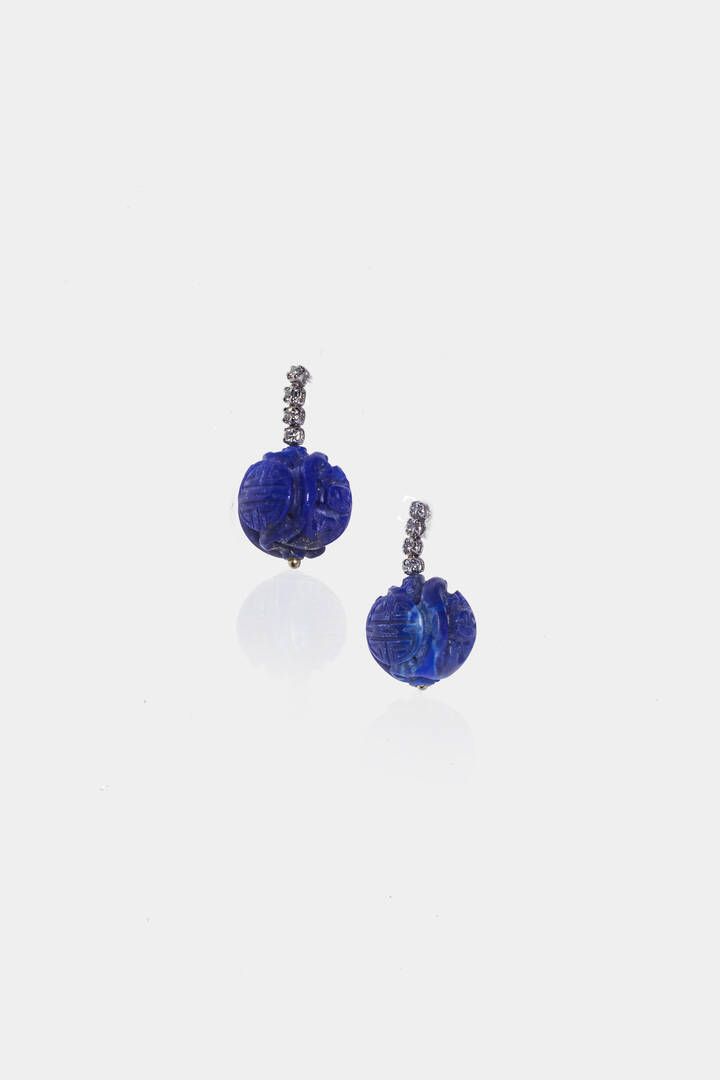 Peso gr 7 0 in oro bianco con corpo in diamanti taglio brillante per totali ct 0 08 ca terminanti con due sfere in lapislazzuli incise con motivi orientaleggianti del diam. di mm 13 5 ca.