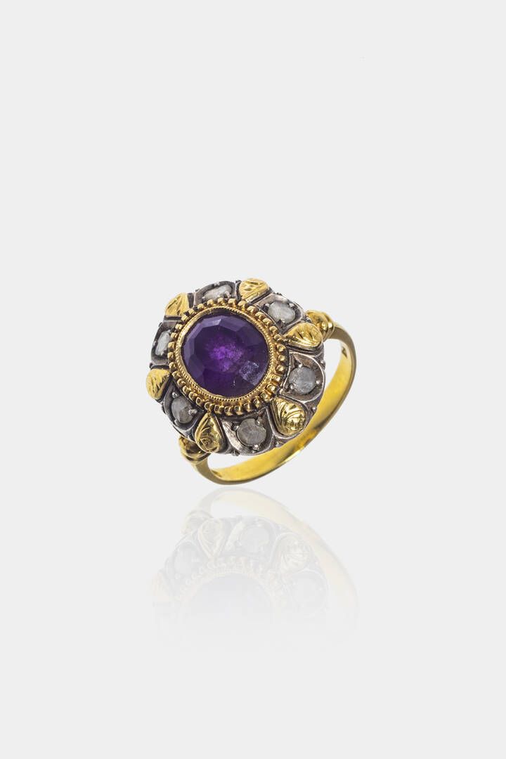 Peso gr 7 0 Misura 15 (55) in oro giallo ed argento sommità ovale con al centro ametista taglio ovale e rosette di diamanti per totali ct 0 20 ca