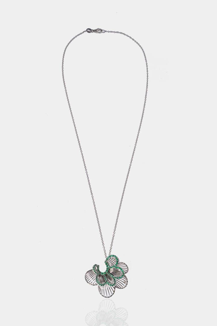 Peso gr 7 2 in oro bianco a forma di fiore con petali traforati e diamanti taglio brillante per totali ct 0 19 ca probabile colore G-H purezza IF-VVS e smeraldi taglio rotondo per totali ct 0 50 ca
