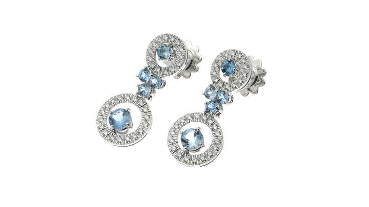 Peso gr 8 4 pendenti in oro bianco con elementi rotondi in diamanti taglio brillante per totali ct 0 66 ca probabile colore G-H purezza IF-VVS e acquamarine taglio rotondo per totali ct 1 73 ca